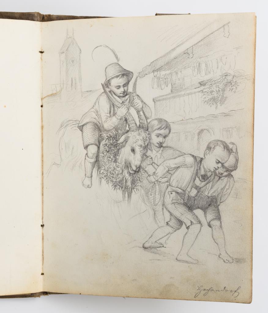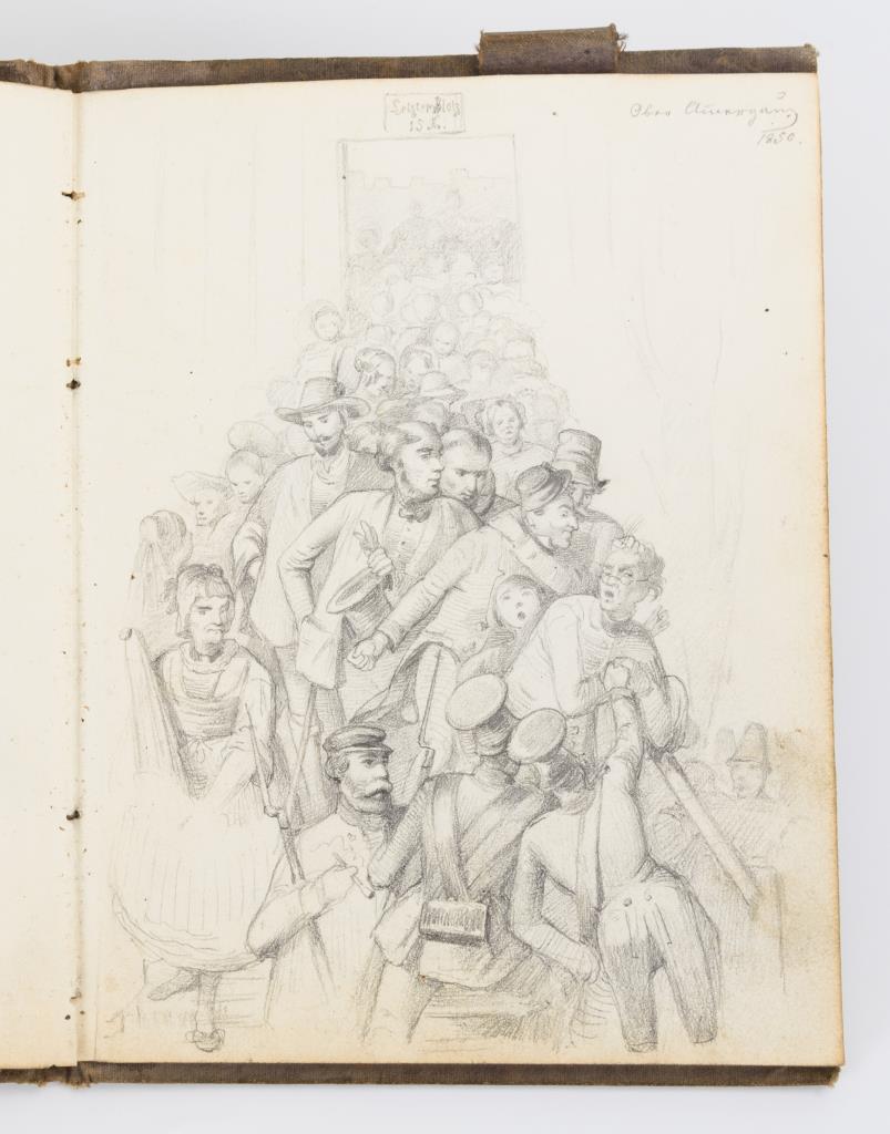 Kleines gebundenes Büchlein mit 33 feinen, teils kolorierten Zeichnungen und Studien, darunter Personen und Landschaften. Etwas fleckig, 1 Blatt mit großem Riss, 2 eingeklebte Zettelchen.