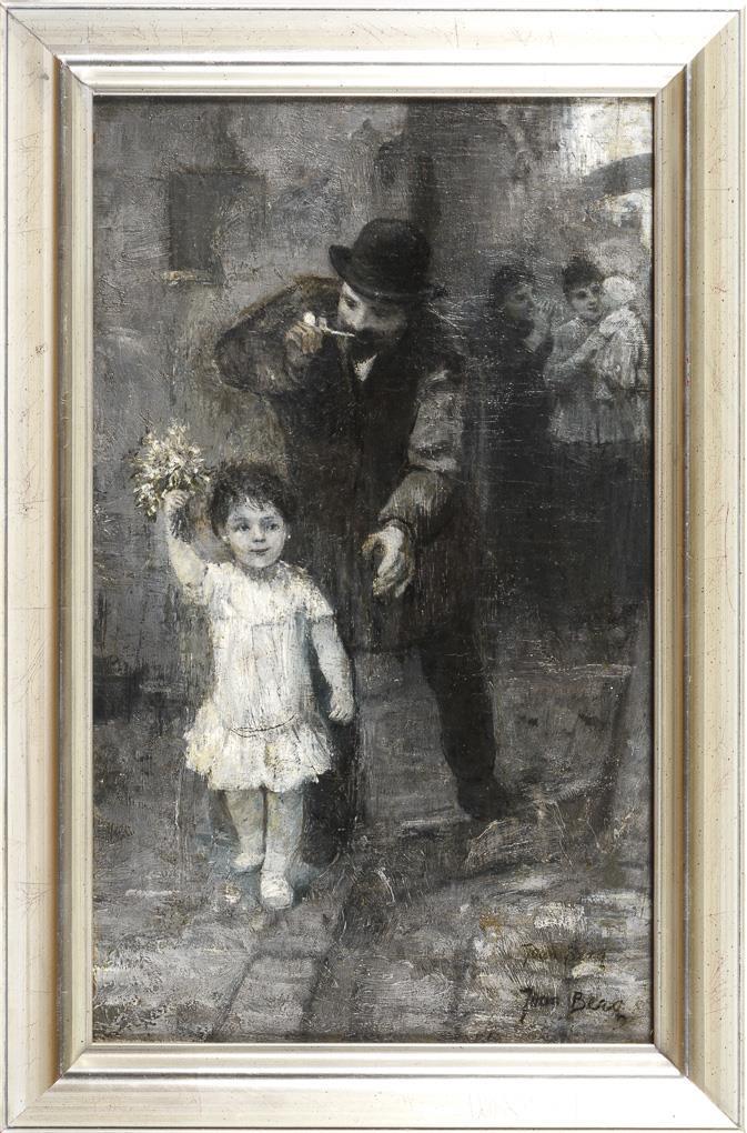 The little girl with the bouquet and the pipe-smoking father behind. A restored spot with backing.