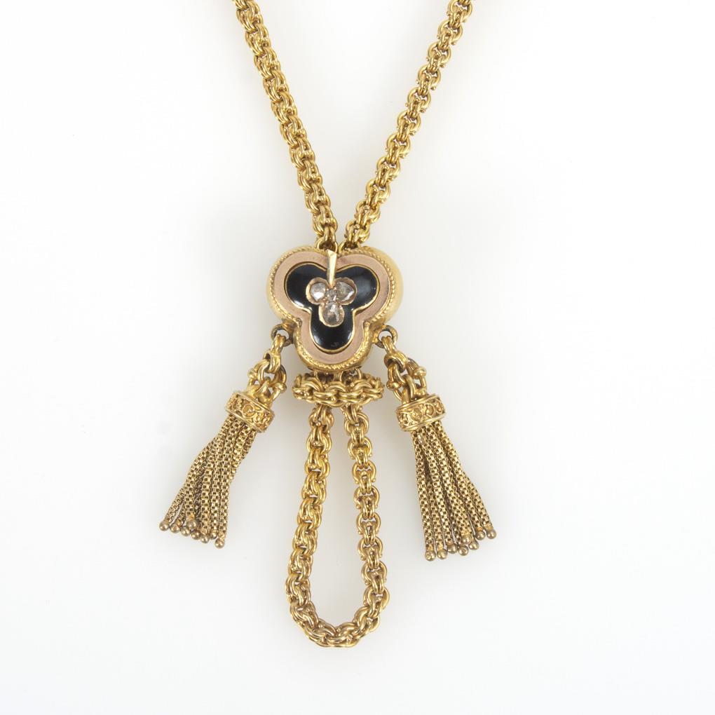 Large chain slide with old-cut diamonds set into both sides and partially enamelled in black. On twin anchor chain with lobster clasp. Probably formerly a watch chain.