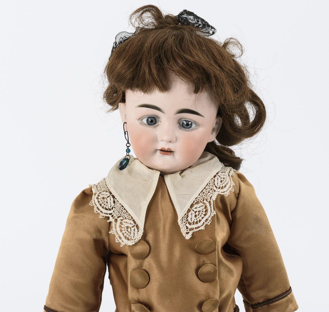 Crank head, fixed blue eyes, brown human hair wig, 1 earring. 13-piece, French link body with glove arms. Resewn brown silk dress, black stockings, old brown leather shoes. Head x-rayed: without defects. Body with few retouchings.