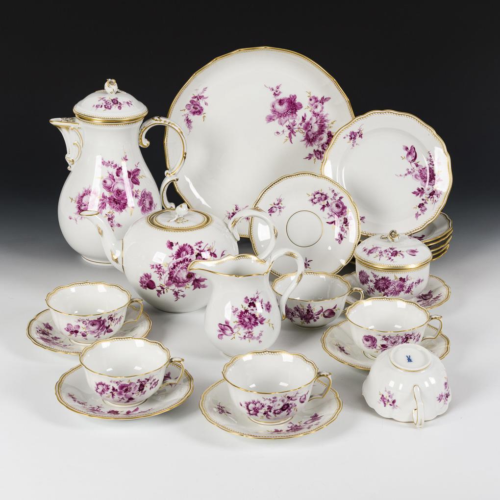 23 pieces. Form "New Cutout". Coffee pot (h 25,5 cm), teapot (h 12,5 cm), milk jug, sugar bowl, 6 tea cups, 6 saucers, 6 breakfast plates and 1 cake plate. Each 1 small bump on the jug lids.