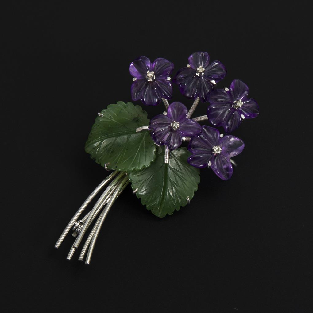 Brooch with cut amethyst flowers, pair of nephrite leaves and small diamonds. Sliding hook.