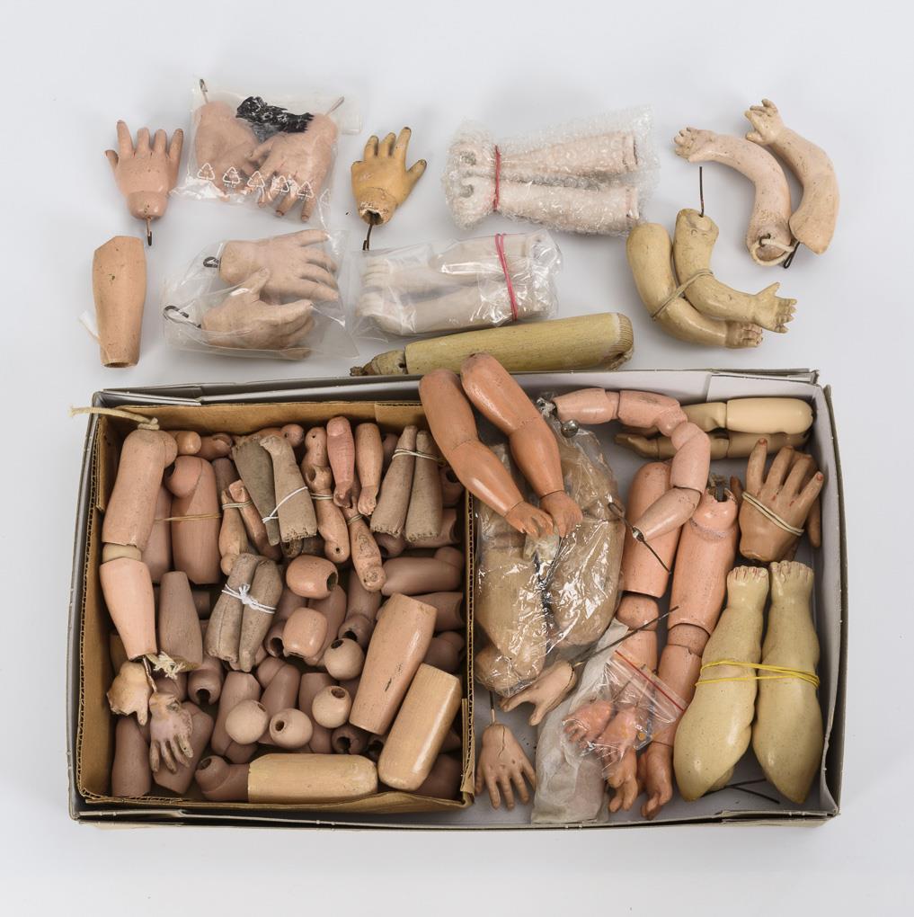 Various spare parts for jointed dolls: Arms, hands, leg elements etc