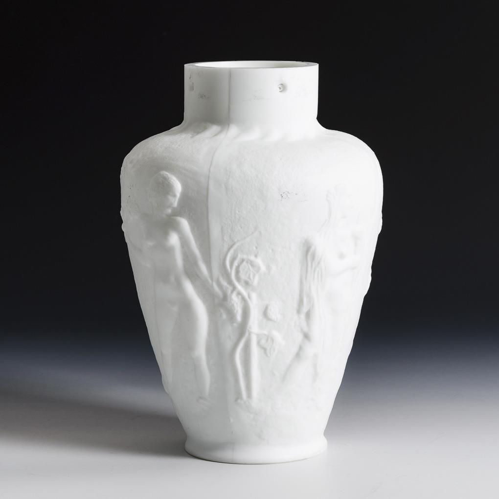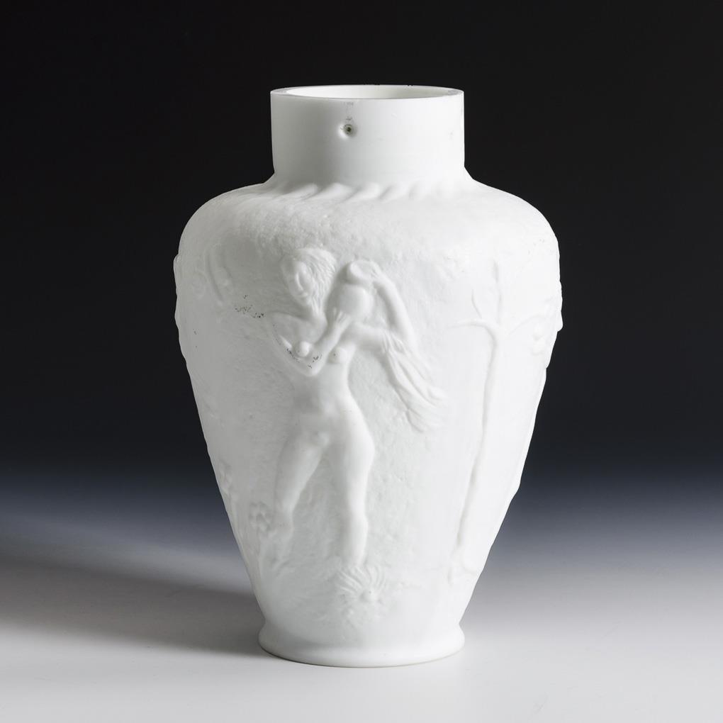 Baluster corpus with relief depiction of four female nudes. At the stand a hole for the wiring as well as at the neck fourfold dented for mounting. Mouth rim somewhat bumped.