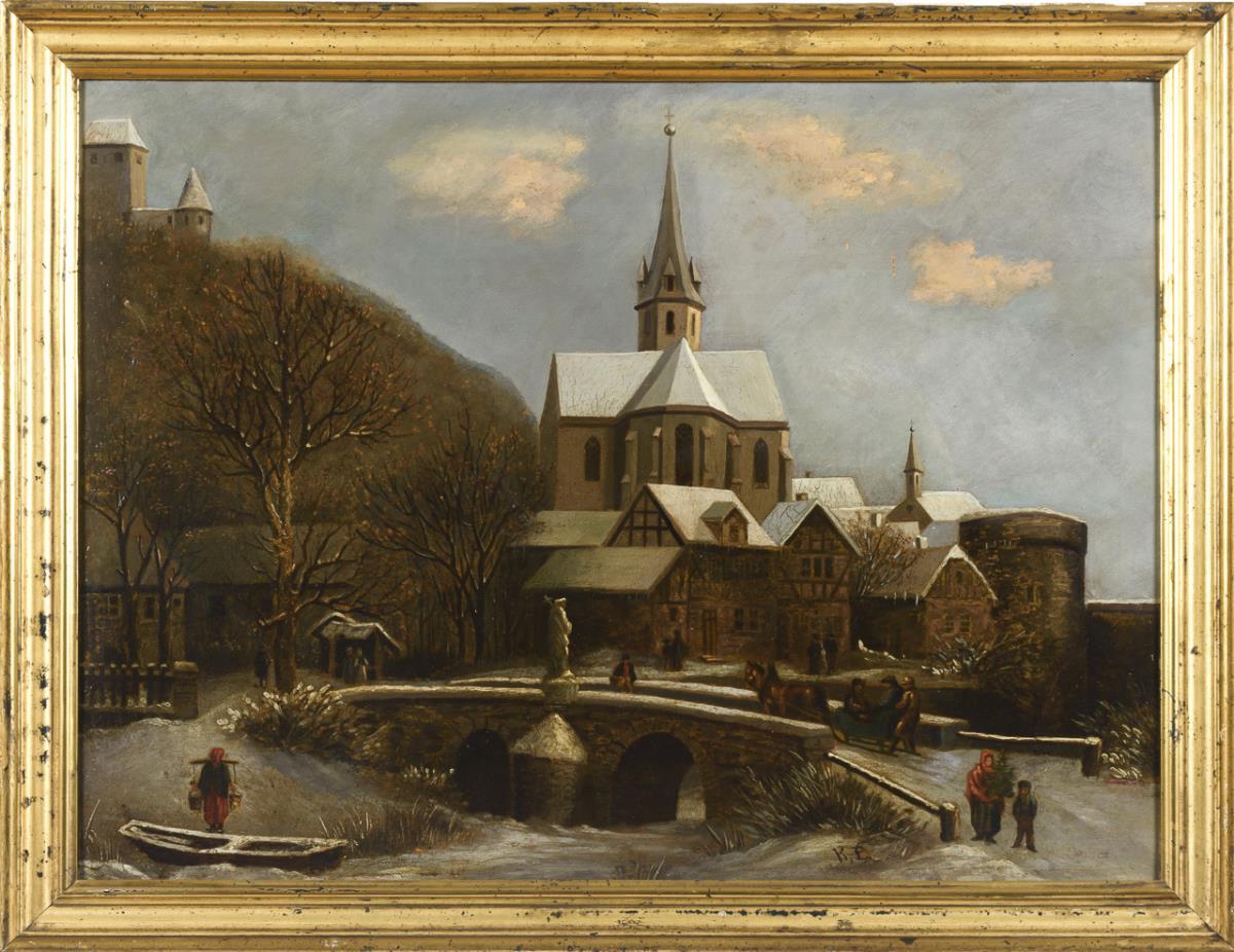 The townspeople on the bridge near the church on a bright winter day. Traces of age.