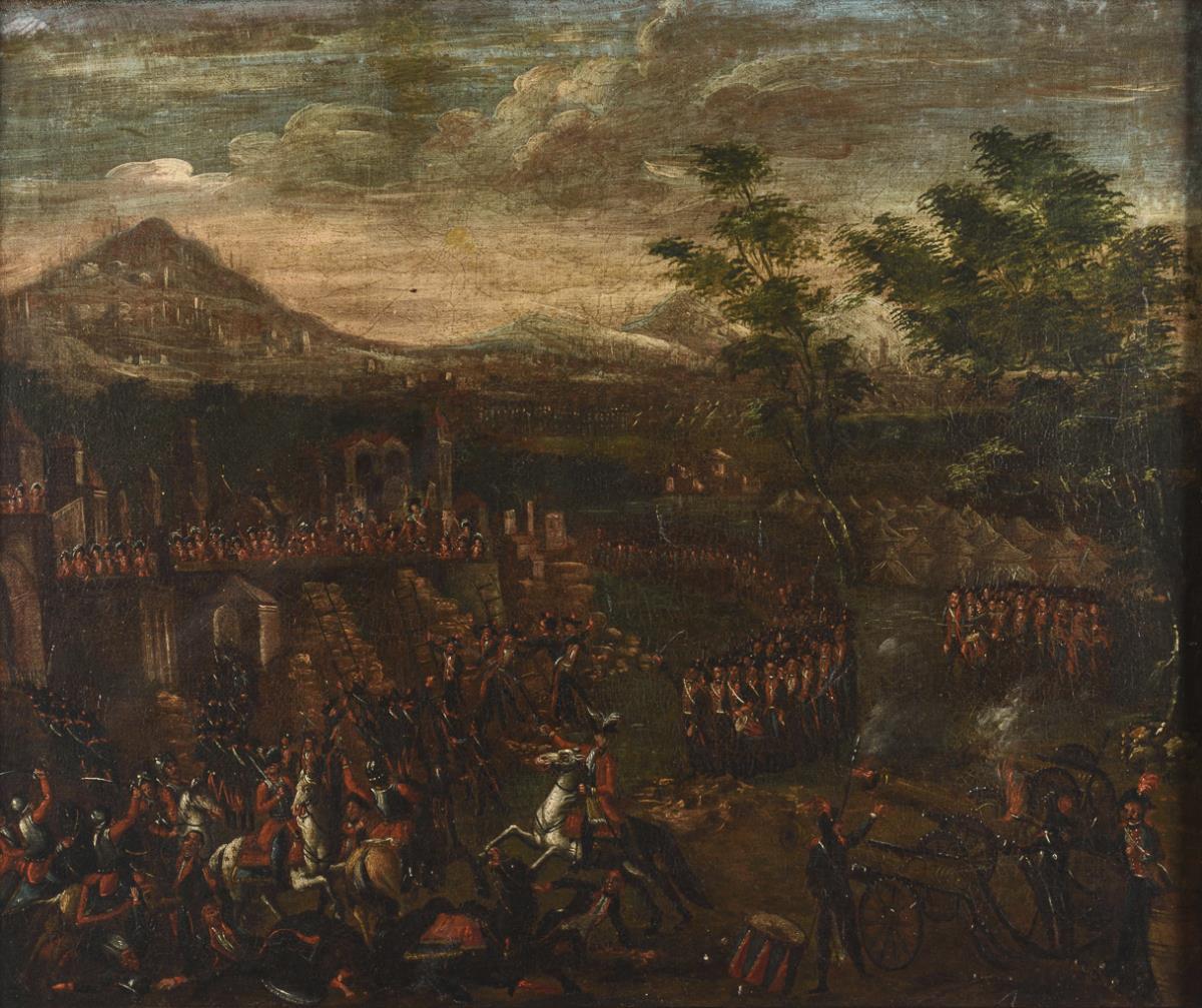 The Storming of a Town in Mountainous Landscape with French and English fighting each other. Canvas doubled.