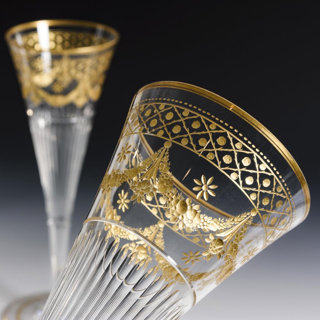 Conical dome merging into faceted stem, round foot. With gilt floral engraving and notched decoration.