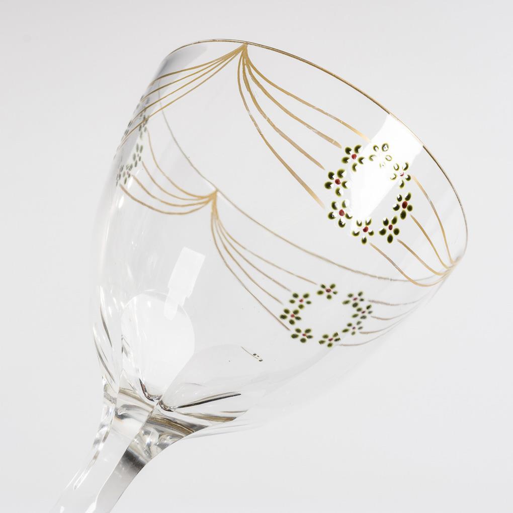 Half-ovoid, faceted dome at the base, stem, round foot. On the dome gold line decoration with three stylized floral wreaths. Partial gold abrasion.
