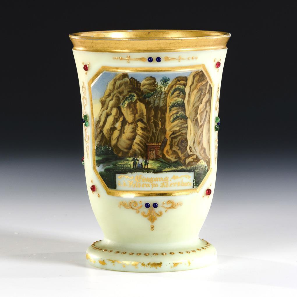 Foot cup with dislocated break-off. On the front a rectangular cartouche with the inscribed view of the "Entrance i.d. Felsen in Adersbach", on the back ornamental gold relief painting with jewel coating. Partial gold rubbing.