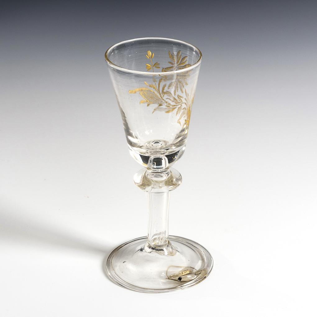 Cone-shaped cup with air bubble pierced in the base of the cup, hollow stem with disc nodus, round foot with everted rim, demolition. On the obverse an engraved, gold-stamped feather poppy stem. Gold somewhat rubbed, enclosed air bubble in the foot.