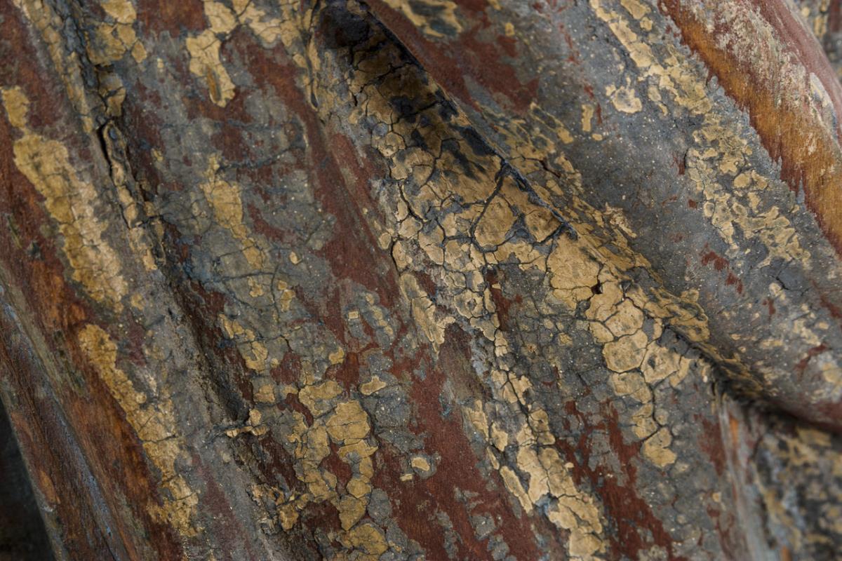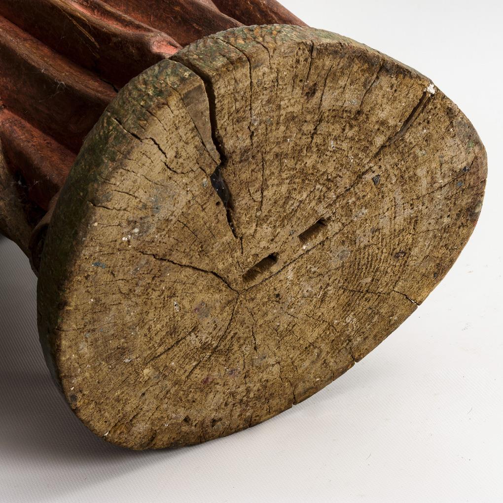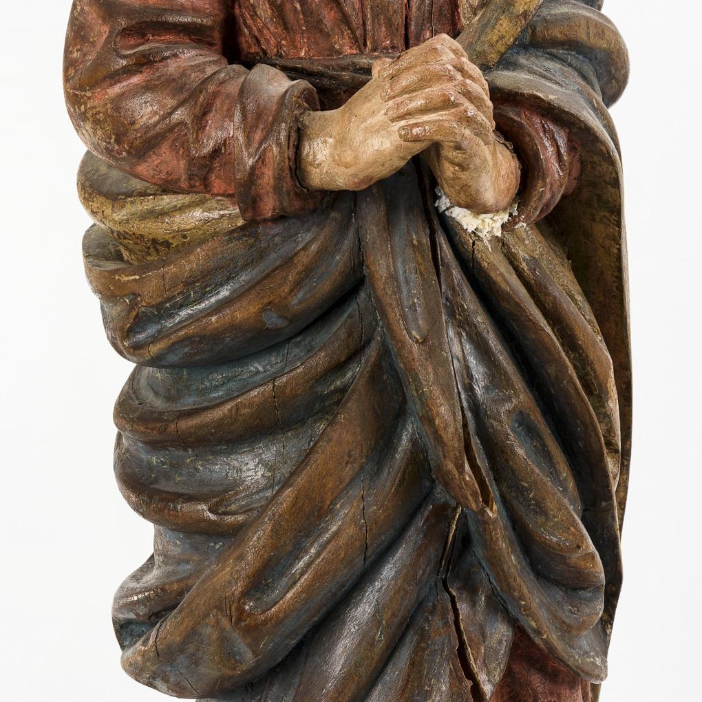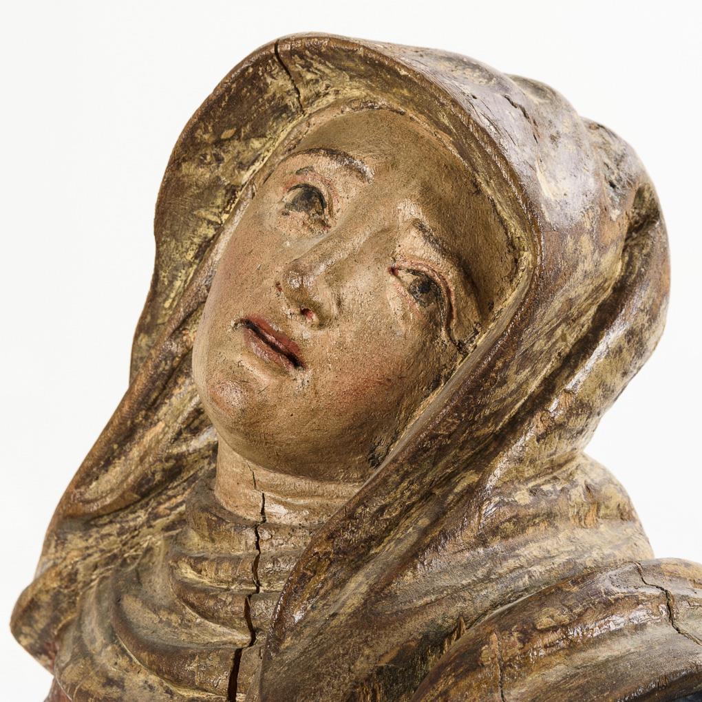From a crucifixion group, fully sculpted figure of Mary movingly folding her hands. Dry cracks, damage to the setting, setting old over.