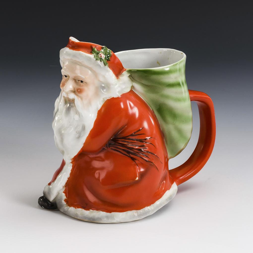Jug in the shape of a seated Santa Claus with rod and sack on his back.