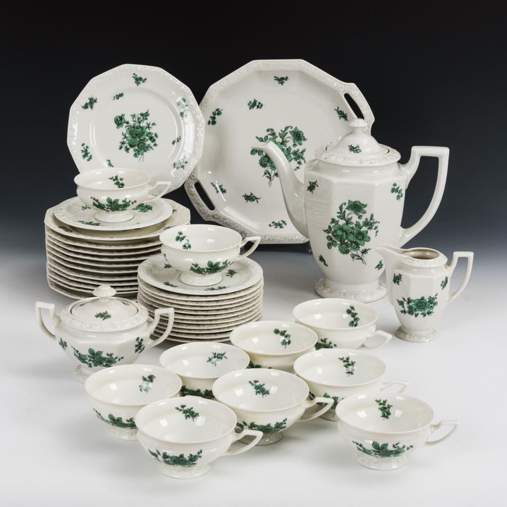 38 Teile. Kaffeekanne (H 25 cm), Milchkännchen, Zuckerdose, 10 Tassen, 12 Untertassen, 12 Frühstücksteller und 1 Kuchenteller. Bestoßung an 2 Untertassenrändern, 1 Untertasse und 1 Tasse mit Haarriss.
