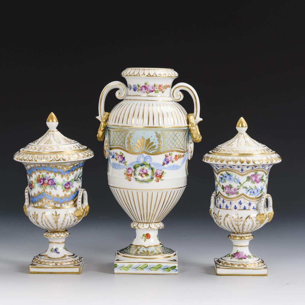 2 crater-lidded vases (h 16 cm), 1 double-handled vase (h 21 cm) and 1 box (h 10.5 cm). All with floral painting and rich gold painting. Addendum 25.10.21: 1 base corner of the large vase minimally bumped.