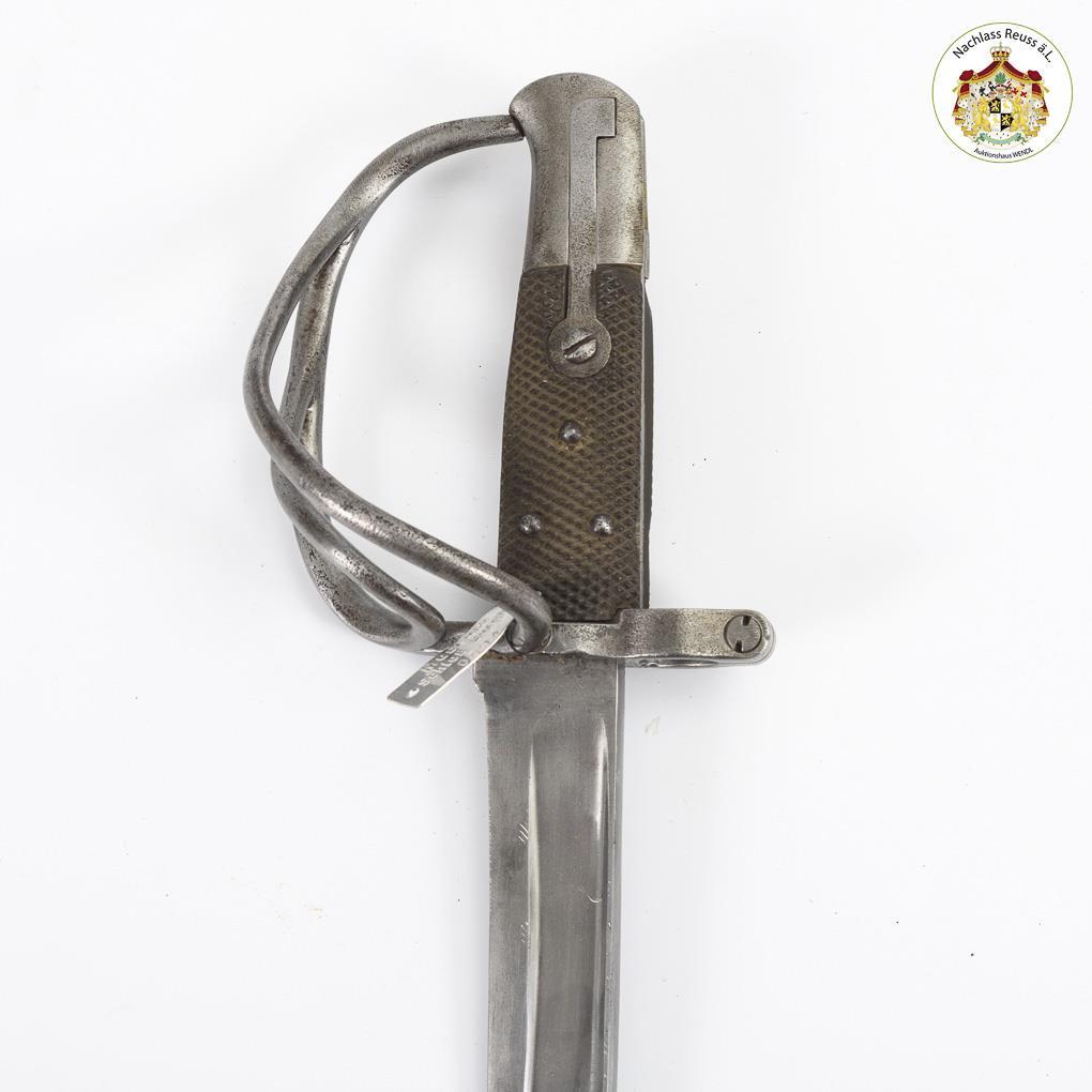 Mountable sidearm with jatagan blade, wide hollow grind, two-shell grip of early plastic with diamond pattern, three-barrel basket and bayonet mechanism. Leather scabbard slightly rubbed.