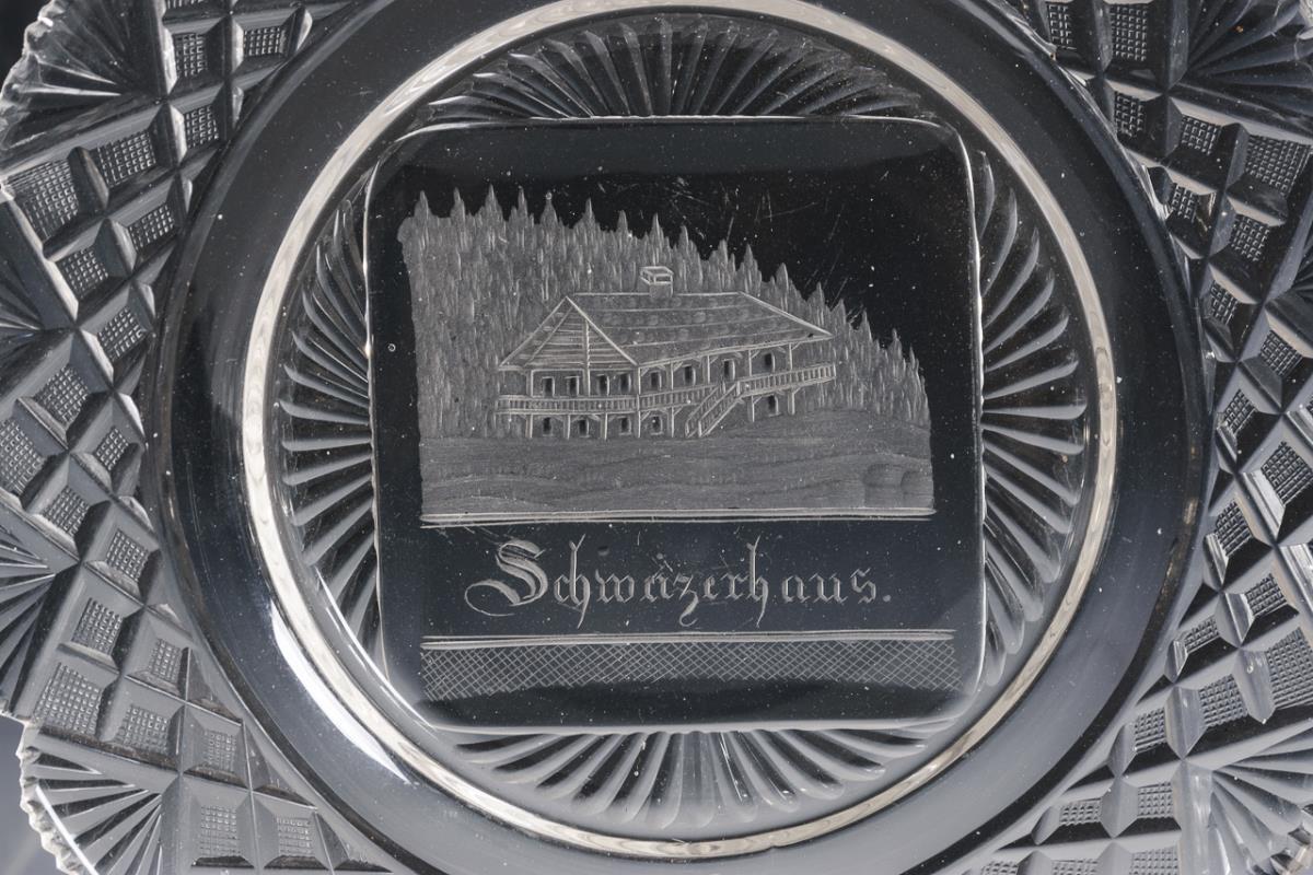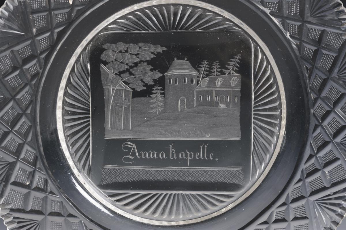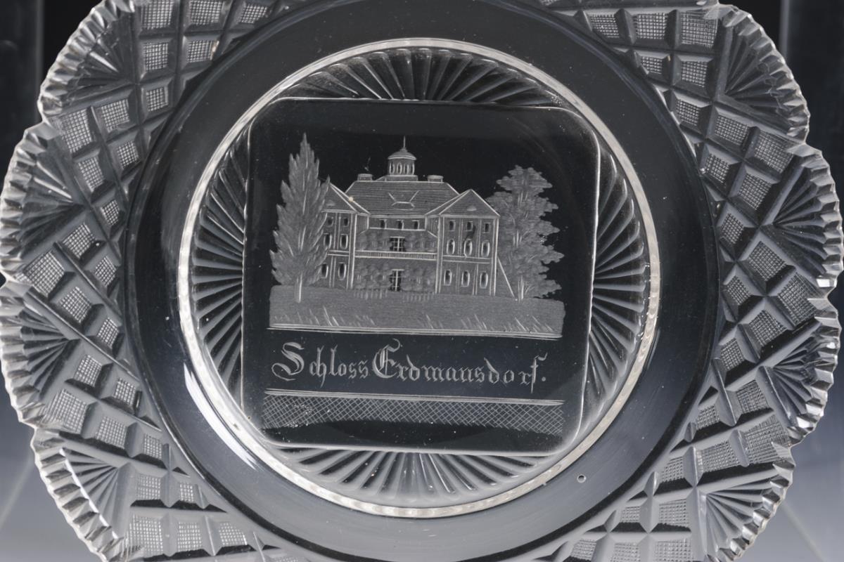 Cake plate with notch- and stone-cut flag and an engraved and inscribed view in the mirror. Partial rim chips.