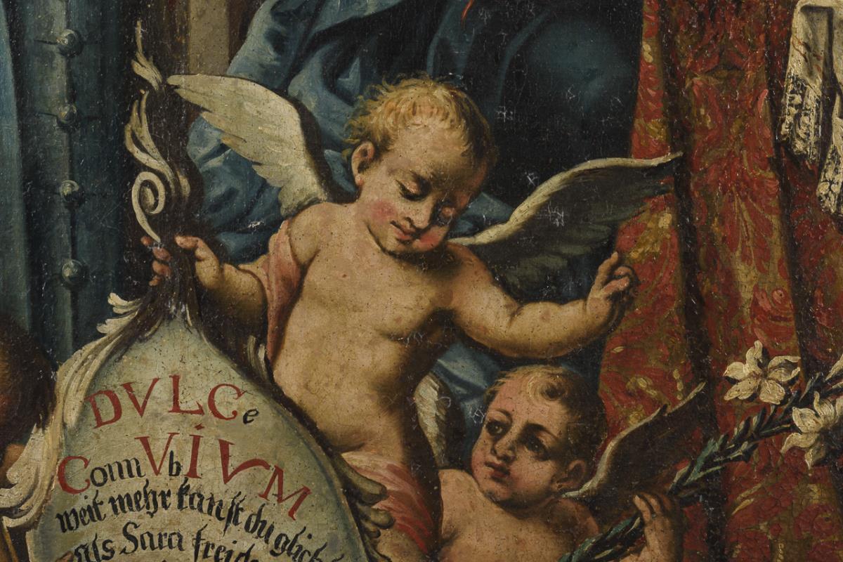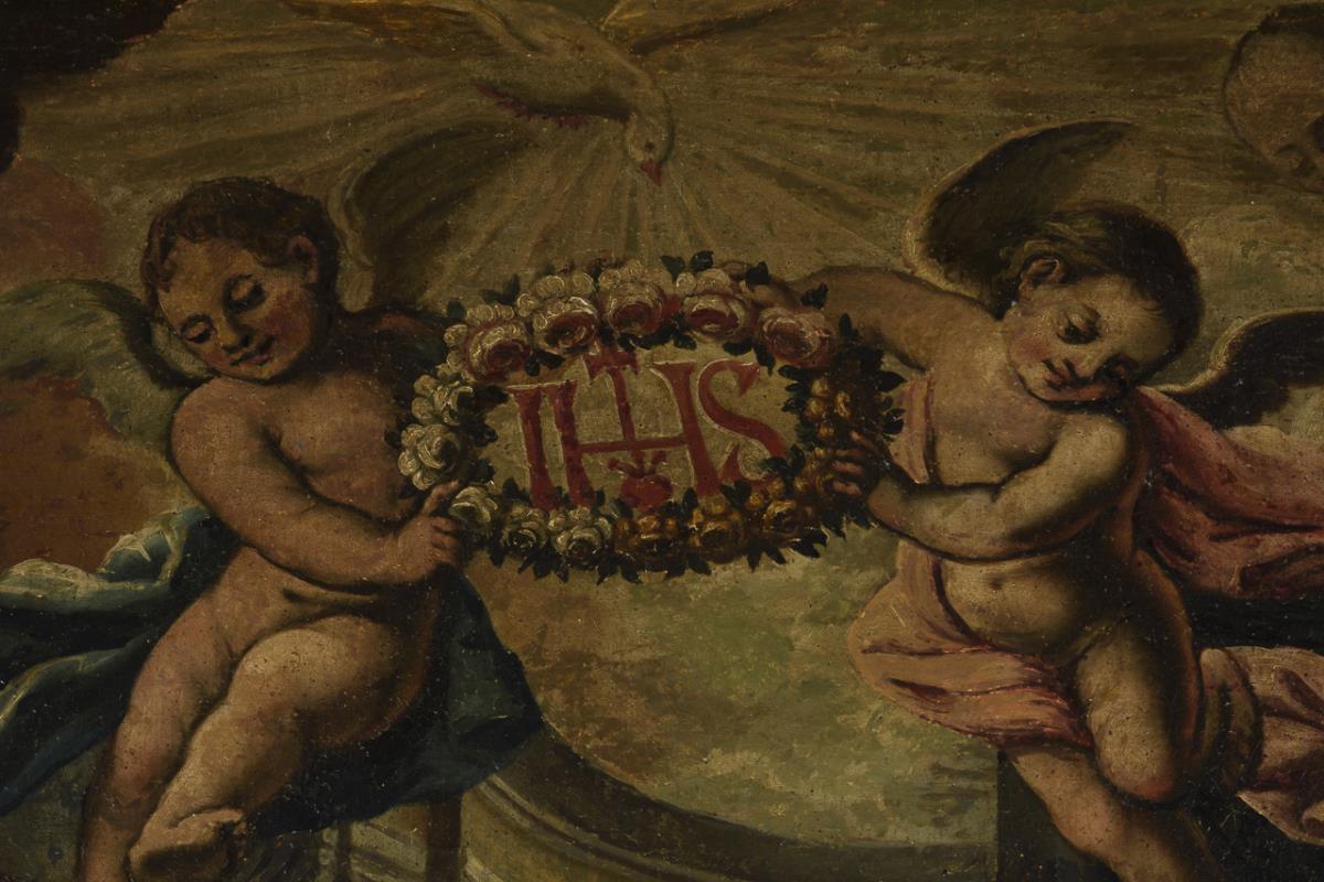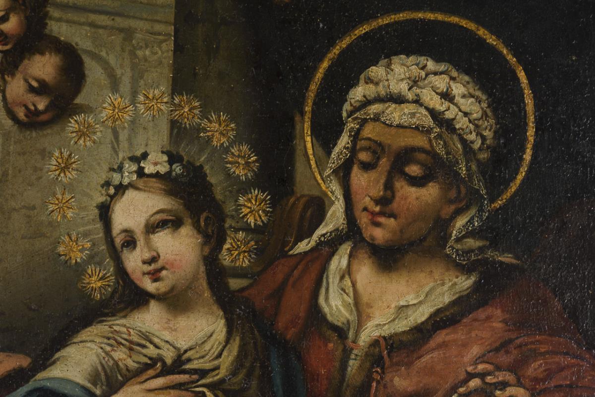 Mary in devotional attitude with the open book on the lap of Anne, above putti with the Holy Spirit, below playing putti at a table with the lily. Canvas doubled, traces of age.