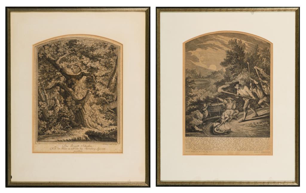 "Das Brunfft-Schiessen: Nach der Natur im Walde bey Starenberg Anno 1737 gezeichnet" und "In der Grafschafft Wolffstein zu Pyrbaum hatt sich vor etlich 40. Jahren folgender wahrer Casus zugetragen: [...]". Stockfleckig.
