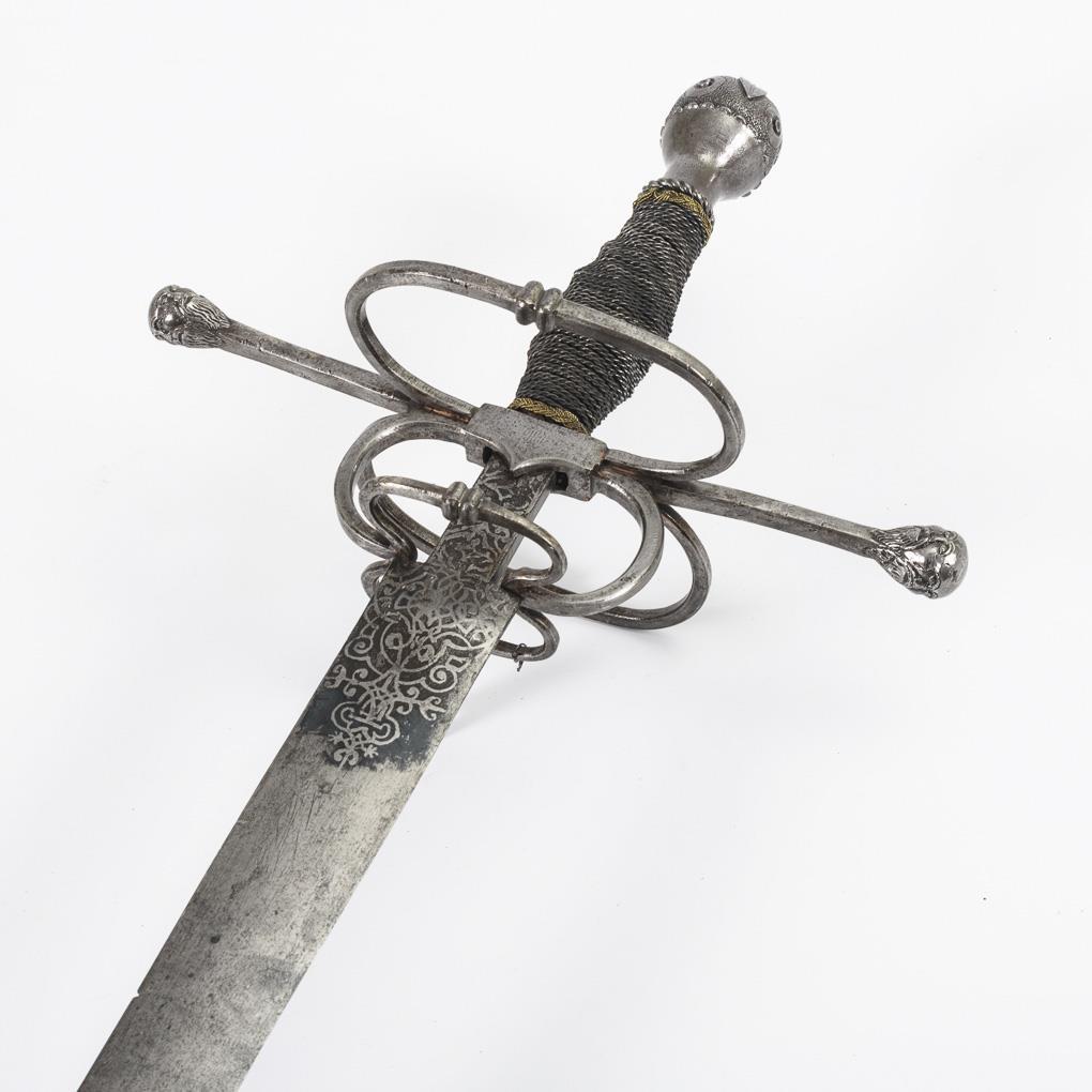 Double-edged blade with etched ornamentation in the lower area. Quillons with bärtige four-faced knives. Handle with wire winding über schräg ribbed grip form. Blade chipped, patina preserved only in the pattern area, wire winding renewed, conservation treated, nice condition.