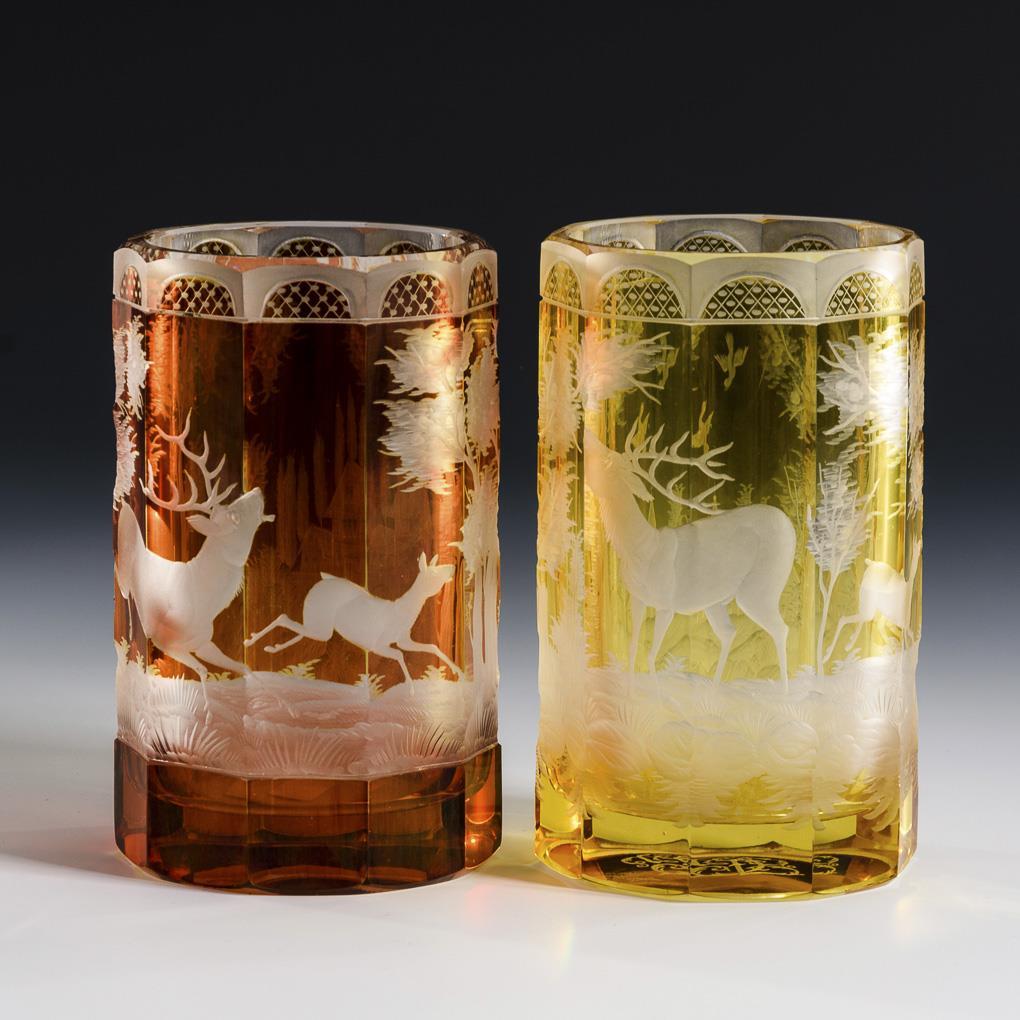 Ten-faced cylindrical goblet with engraved depiction of a forest landscape with deer and hind.