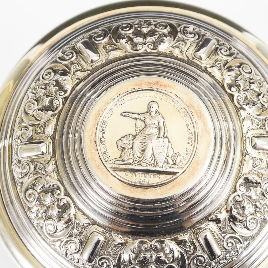 Quality crafted partially gilt tankard with mounted medal of a Swedish insurance company, inscribed: "Gothenburg 1866" on the lid.