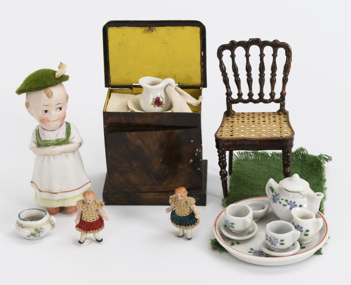 Washstand with hinged top, wash bowl and jug. Chair with light perforated seat. Accompanied by bisque figurine, 2 dollies, tea service on tray, green carpet and 2 wall paintings. Hinge of wash chest repaired, chair with several small repairs.