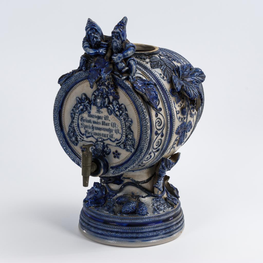 Liegendes Fass auf Rundsockel, mit historistischem Reliefdekor und teilplastischen Verzierungen, originaler Zinn-Zapfhahn. Fehlender oberer Verschluss (wohl mit Leinentuch und Korken), partiell bestoßen.