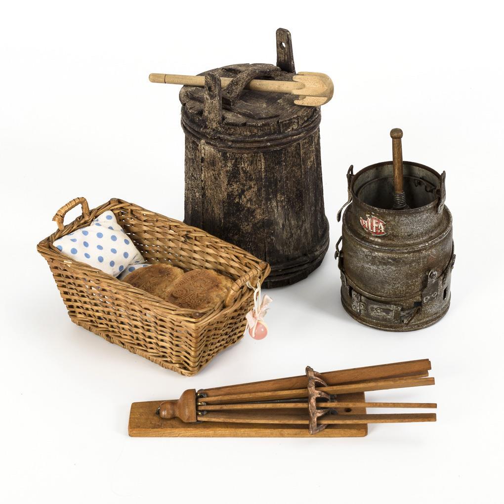 Conical wooden laundry tumbler with whisk, heatable washing kettle "ALFA" (lid missing), collapsible rotary clothes dryer for wall hanging, laundry basket and 2 bars of soap. Partly with traces of age.