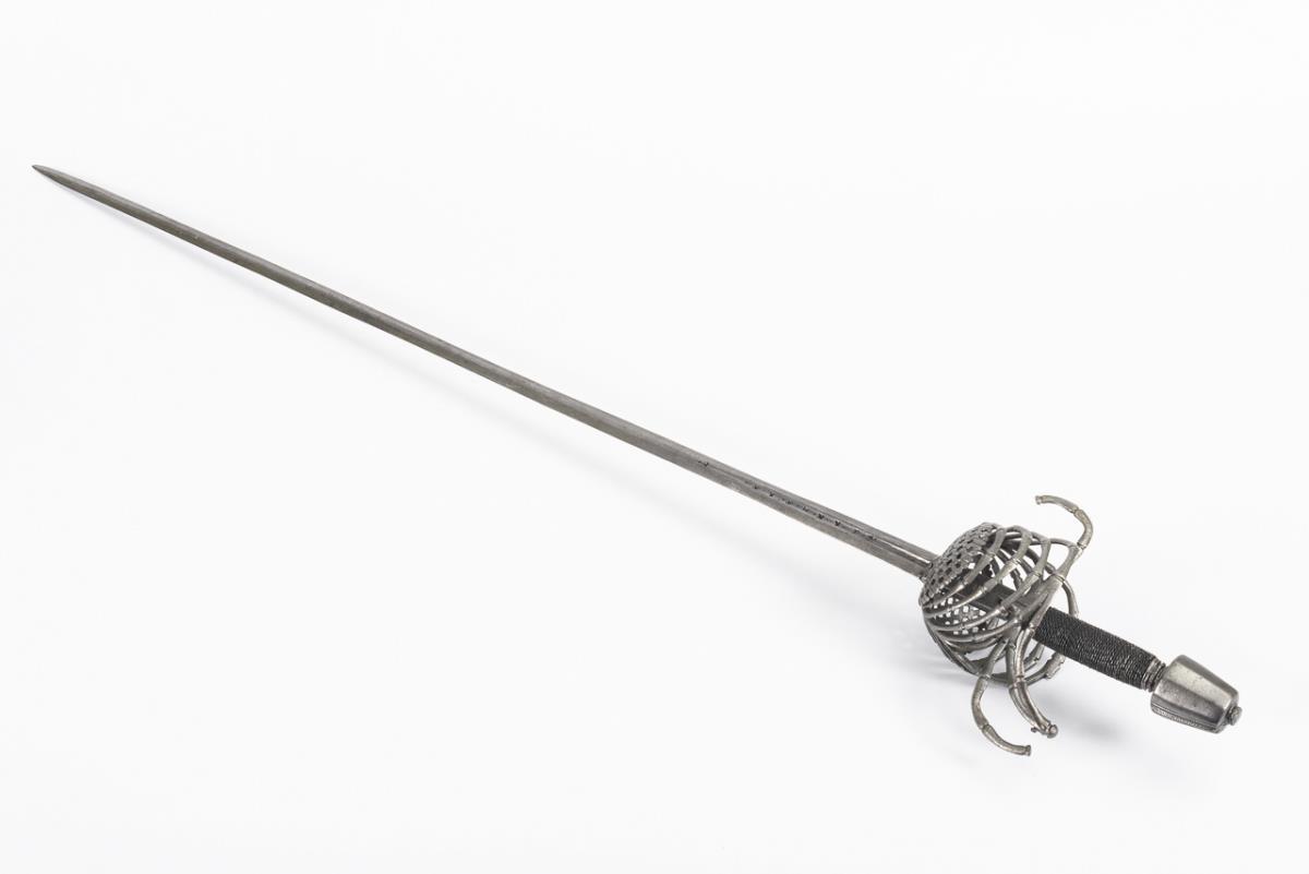 Double-edged blade with lenticular cross-section. Short fullers on both sides on the midline with inscription "HARNHARN" and anchor. Also on both sides on the ricasso concealed by the basket a marked "M", a crescent moon, and another marked "M". This indicates a blade from Toledo. Basket with openwork guard and quadruple bolsters. Six-pointed, conical pommel with 'seam'. Probably previously conservatively treated, a secondary guard missing. Very nice condition.