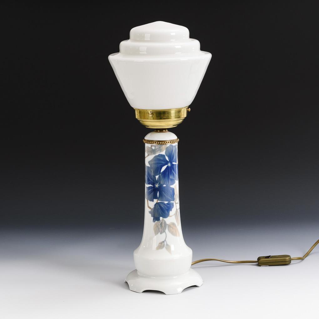 Porcelain stem with painted clematis vine, conical stepped frosted glass shade. Electrified (function not tested).