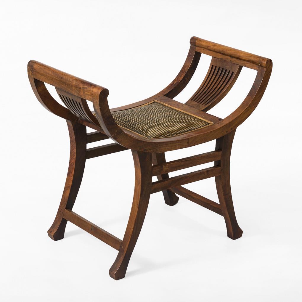 Side stool with vertically braced side supports and cross bracing on the concave curved legs. Seat upholstery of wicker. Restored, slight signs of age/use.
