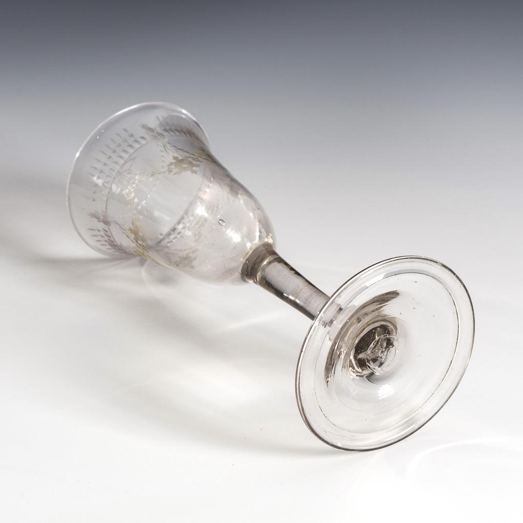 Slim bell-shaped cup, stemmed stem, round foot with everted rim, demolition. On the dome engraved floral garlands under a wreath of pin flowers.