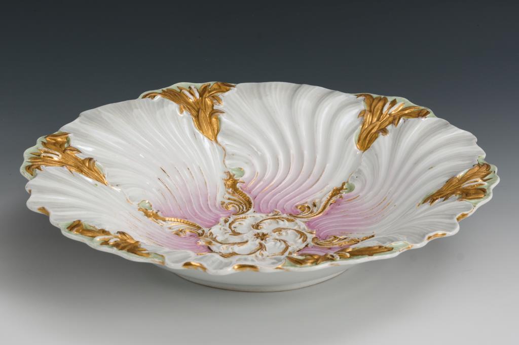 Muschelschale mit Rocaillerosette im Spiegel. Partieller Goldabrieb.