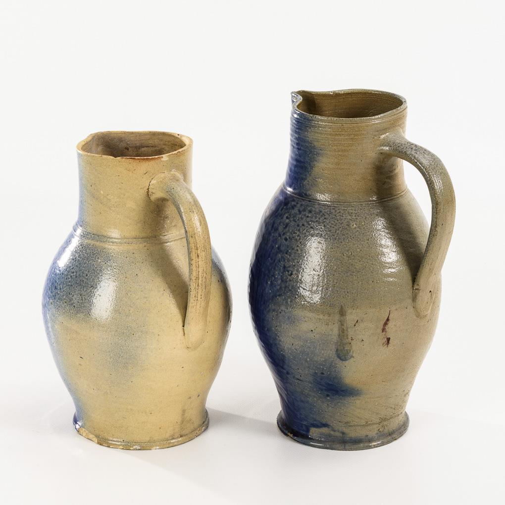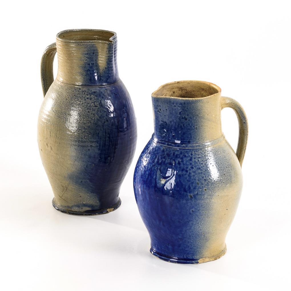 Grey salt-glazed stoneware, cobalt blue smalt throw. H 24.5 and 28 cm.