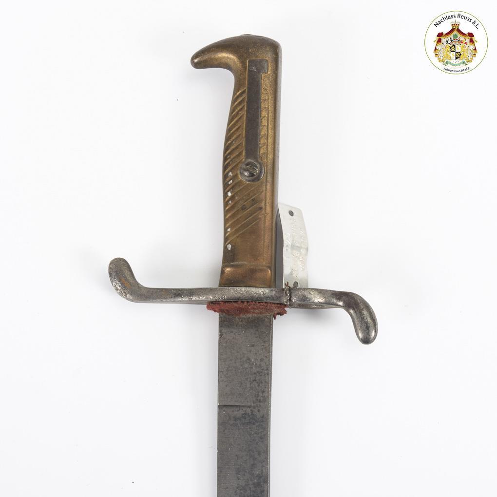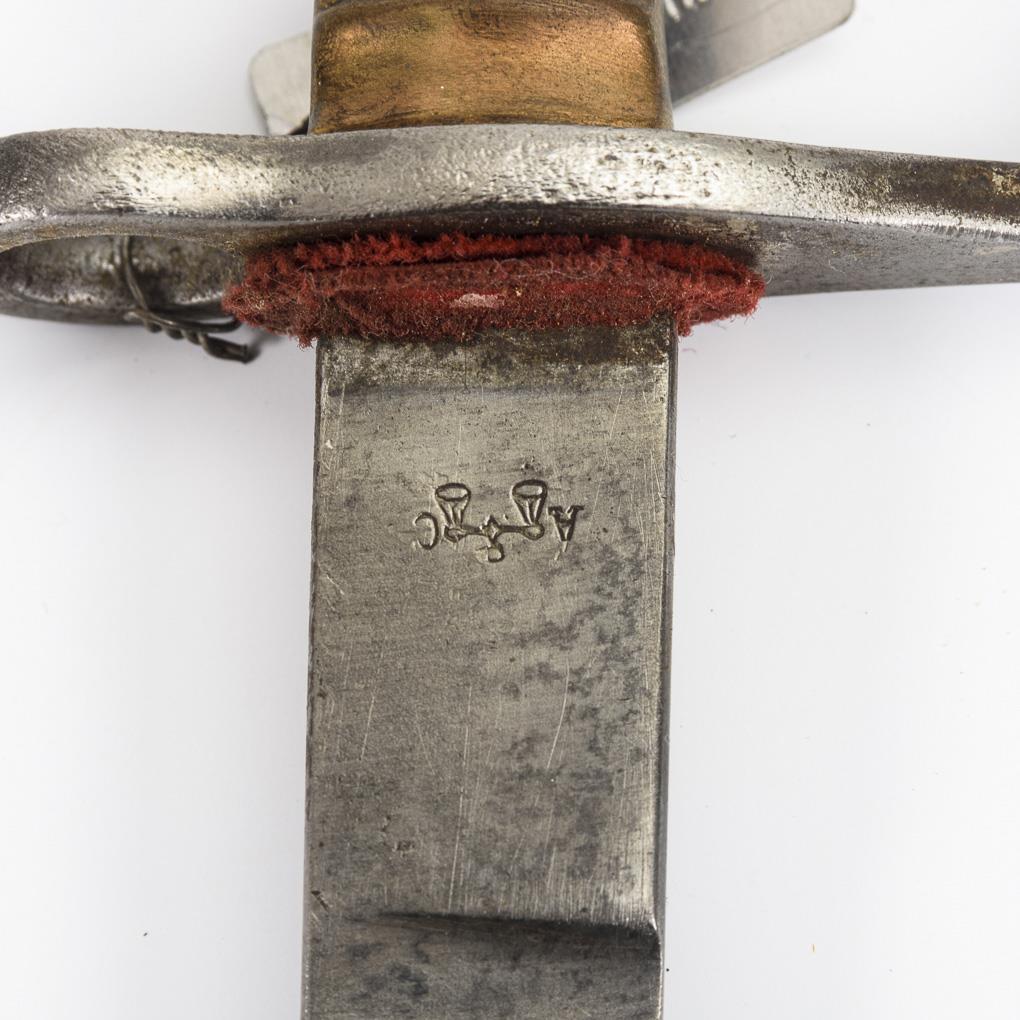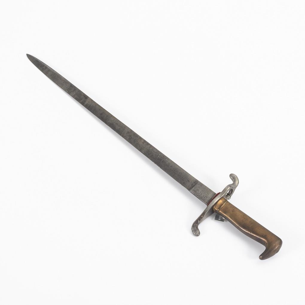 Straight, smooth, single-edged blade. Brass grip ribbed on one side. Relatively small and massive muzzle hole.