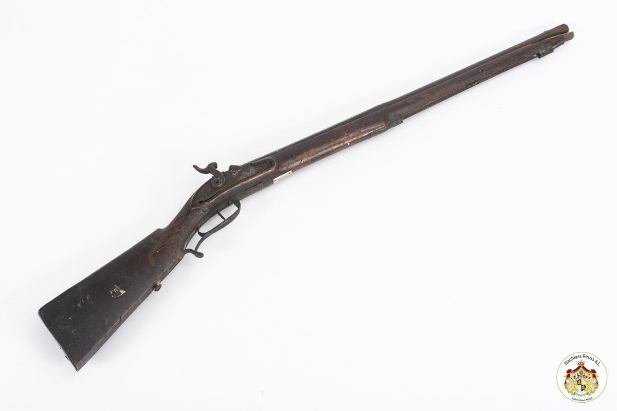 Weapon in need of restoration. Barrel of 18-gauge, octagonal in the rear, loosely resting in the stock. Wooden stock with decorated grip and traces of old anobia attack and missing part at the tip. Butt end with brass plate, counterlock plate also made of brass. Weapon probably apted, tip of pistol missing, mechanism not common.