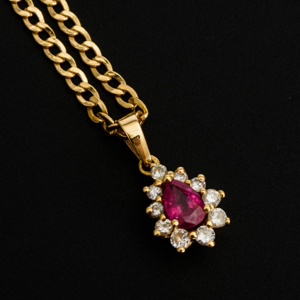 Tropfenförmiger Rubin, umgeben von 10 kleinen Brillanten. Flache Panzerkette mit Ringfederschließe.