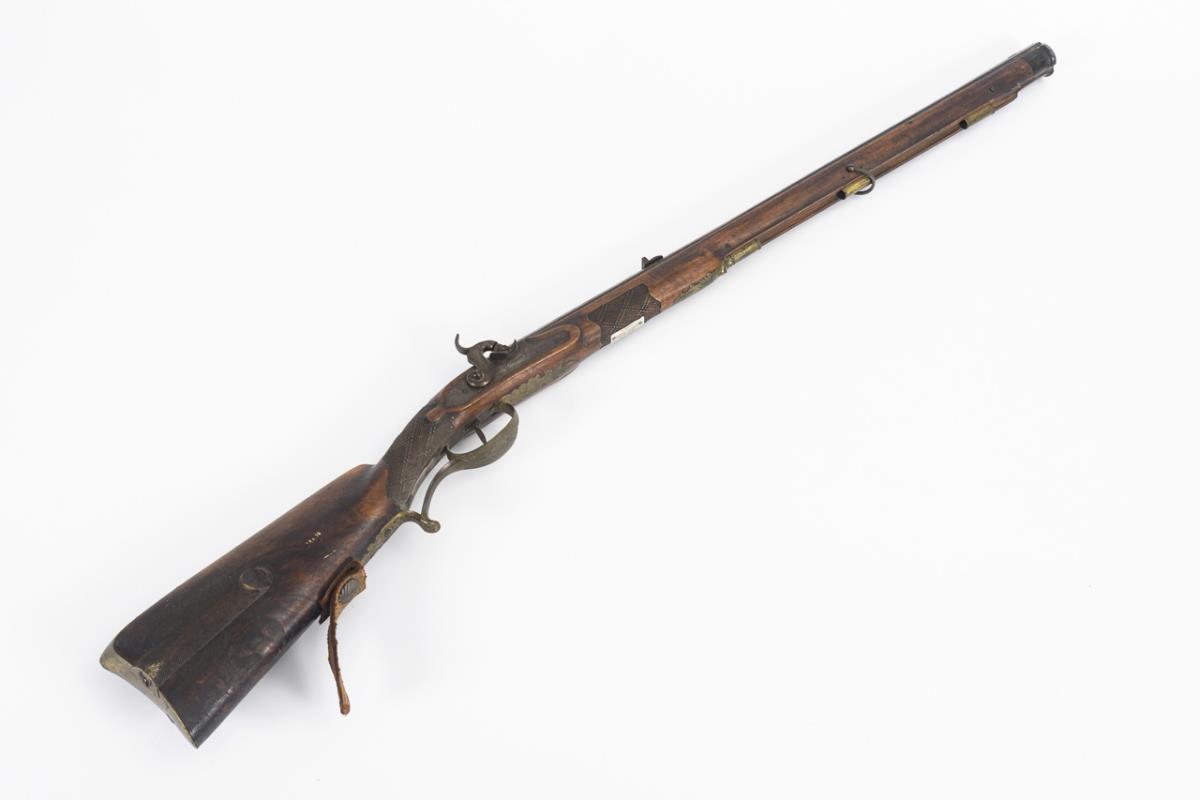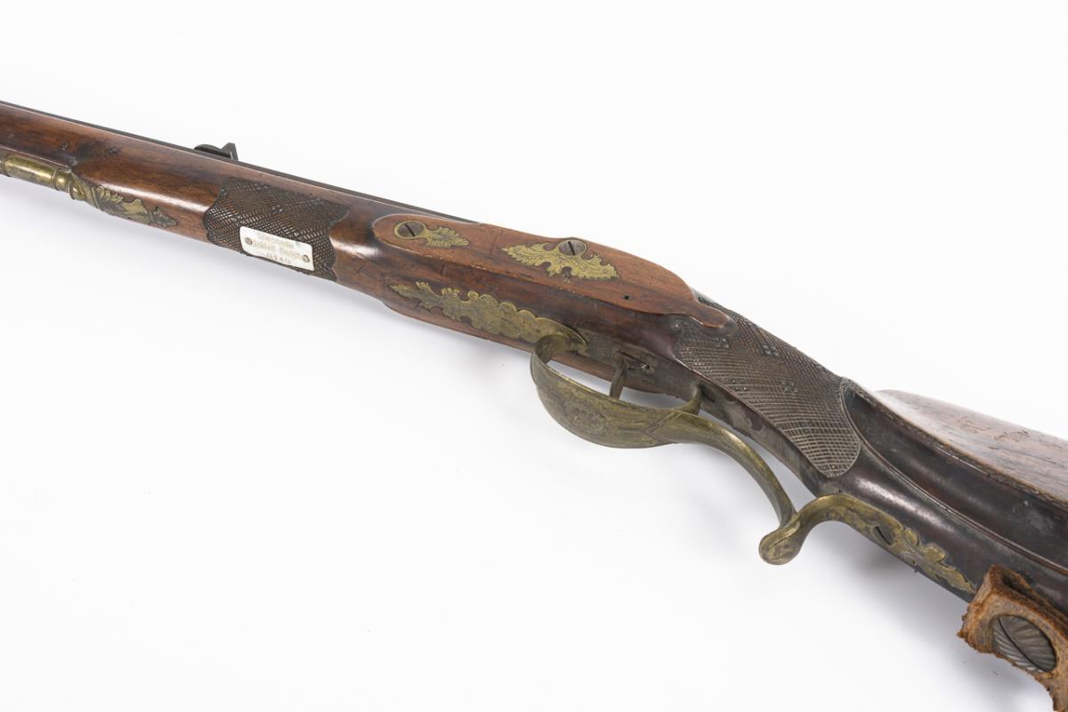 Octagonal rifled barrel in 16 mm calibre, marked "No. 2". Ornate lockplate marked "Keiner Dessau", counterplate executed as a floral brass piece. Inlaid coat-of-arms monogram plastered on the decorated grip. Stock with compartment and butt with further careful decoration. Shaft tip made of horn. Remnants of original strap. Loading stock missing, nice condition for age.