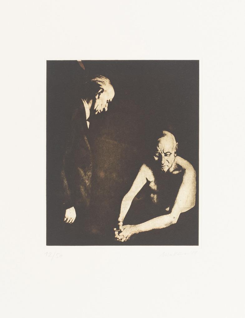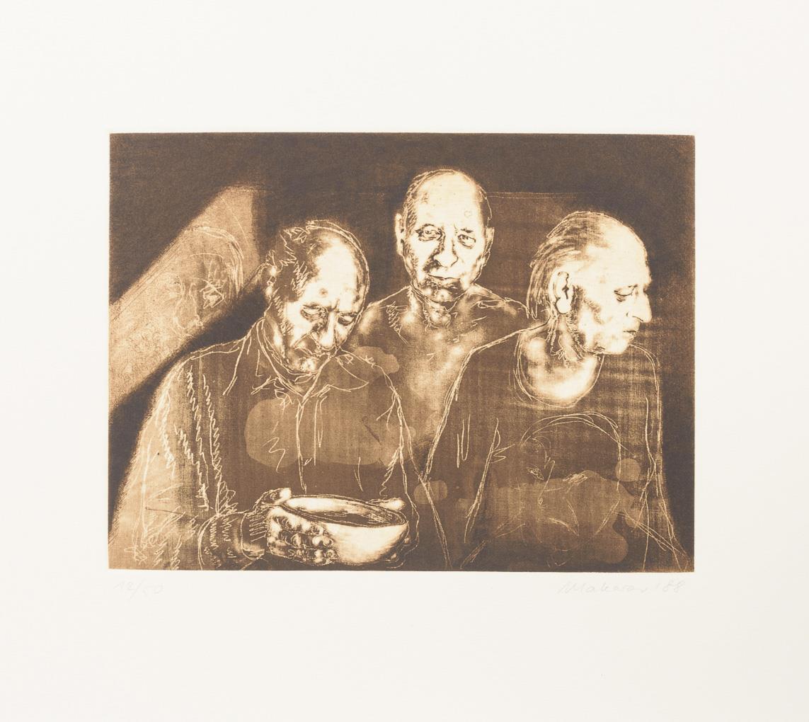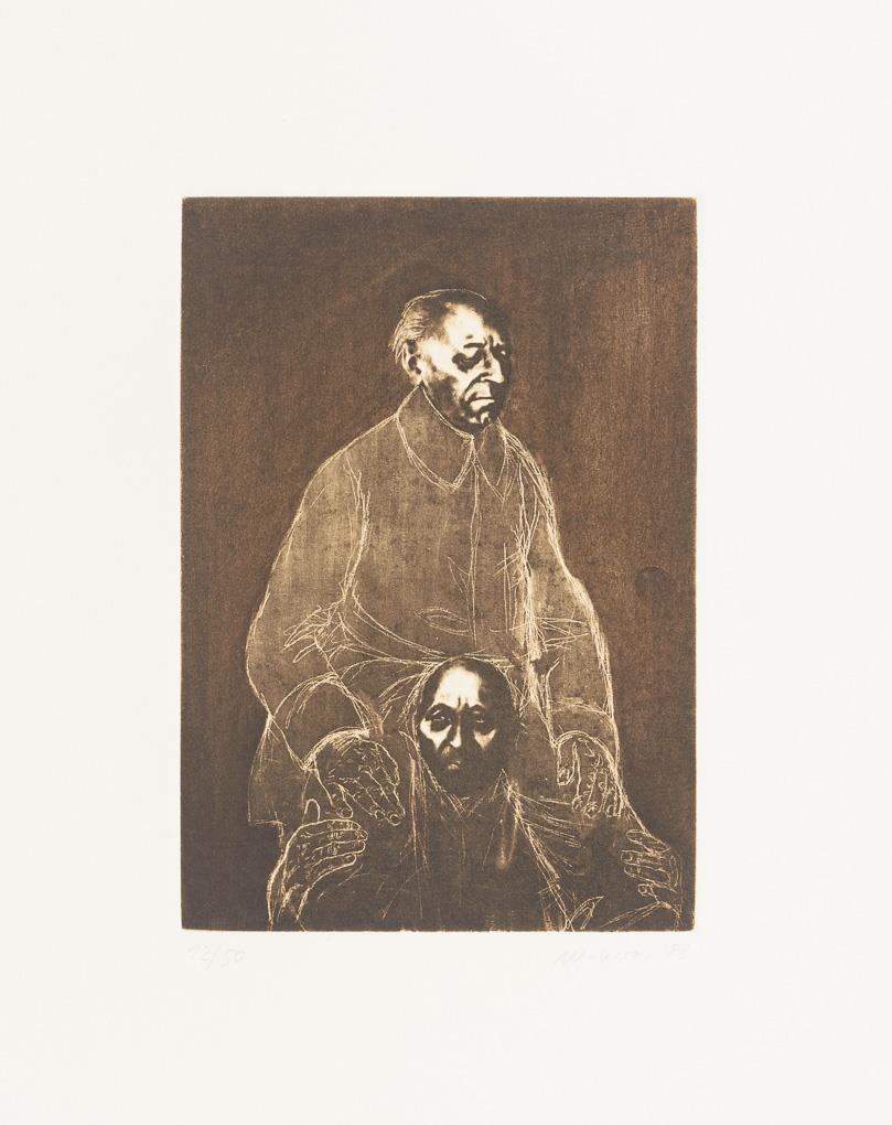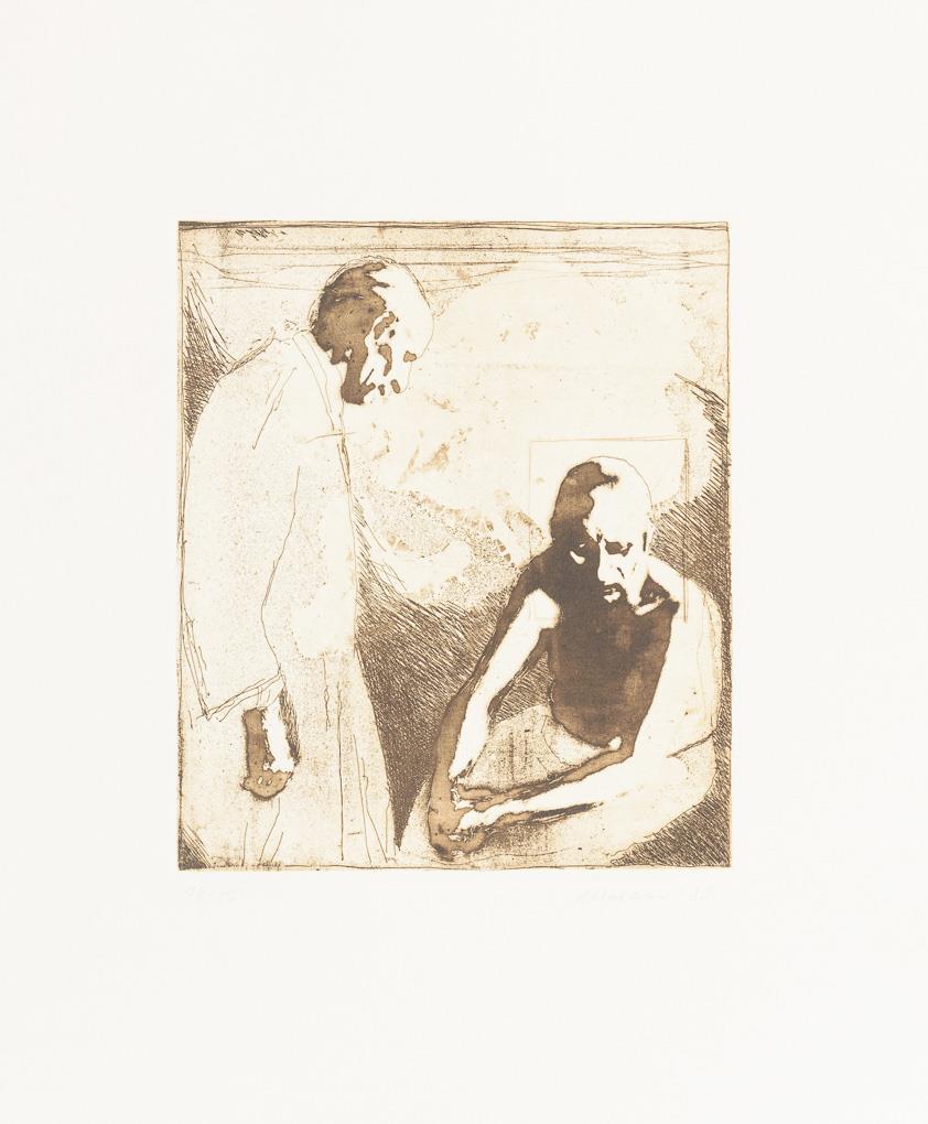 Complete, original cassette-folder with 10 etchings and 1 title-page to a cycle of paintings by Nikolai Makarov - "Painted in muted colours or in the grisaille technique, the paintings of the cycle "The Late Freedom", created between 1984 and 1987, show elderly people depicted [sic!] by Nikolai Makarov alone or in groups. Their resigned posture and facial expressions convey a sense of hopelessness and humbly endured hardship. Crouching in front of a diffuse monochrome background, portrayed frontally or in profile without any accessories, or symbolically united with each other in a boat, the aged individuals of "Late Freedom" convey a metaphorical view of the personal crises of a generation cheated of its life, which will no longer be able to savour its freedom, questions itself and states that it has a score to settle with life." (quote seen at http://www.nikolai-makarov.de/gallery/spaete-freiheit.html).