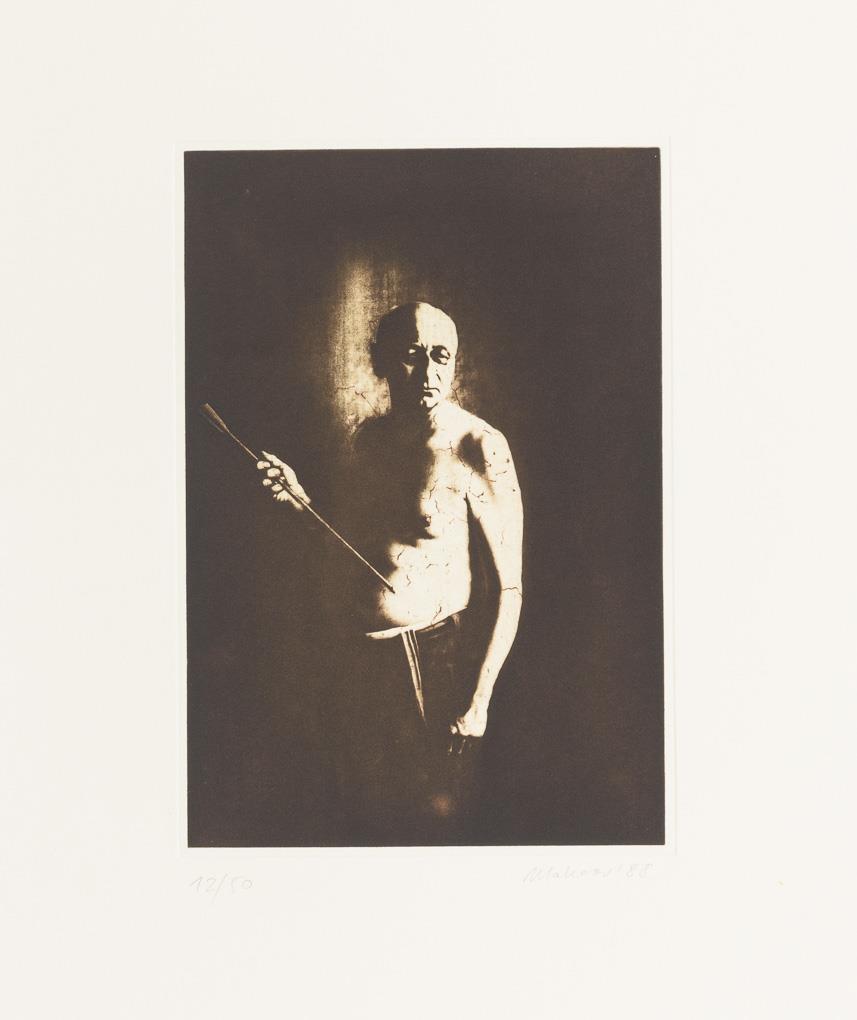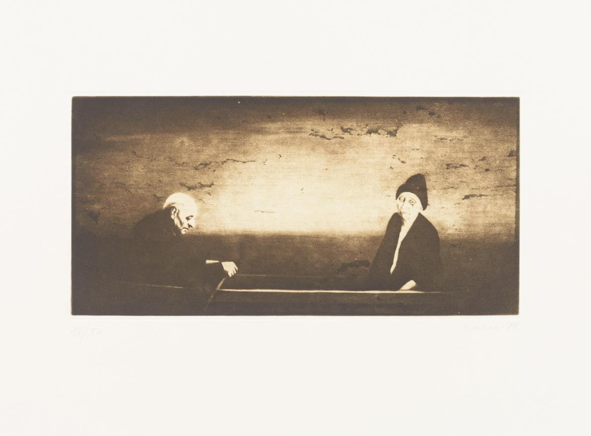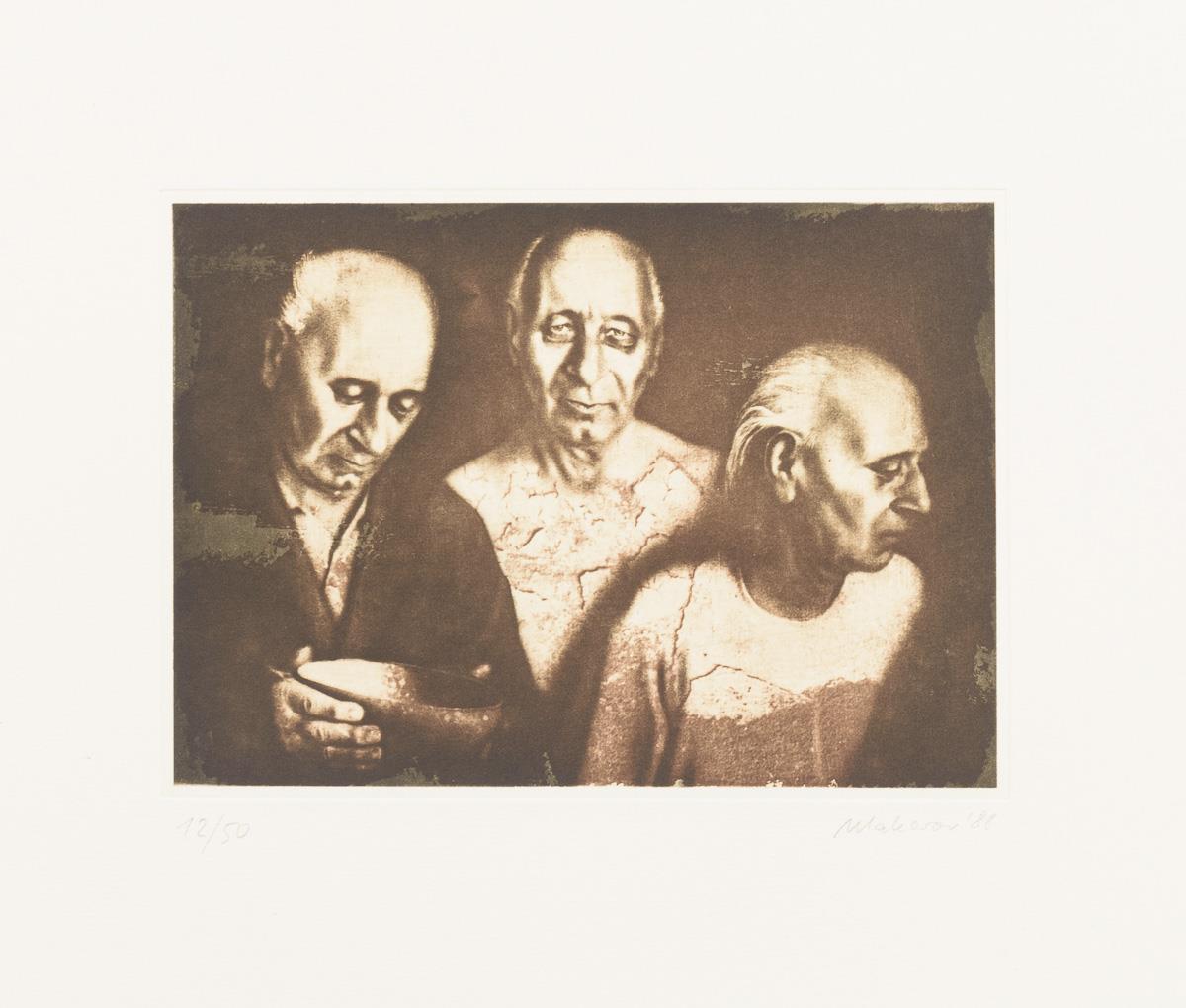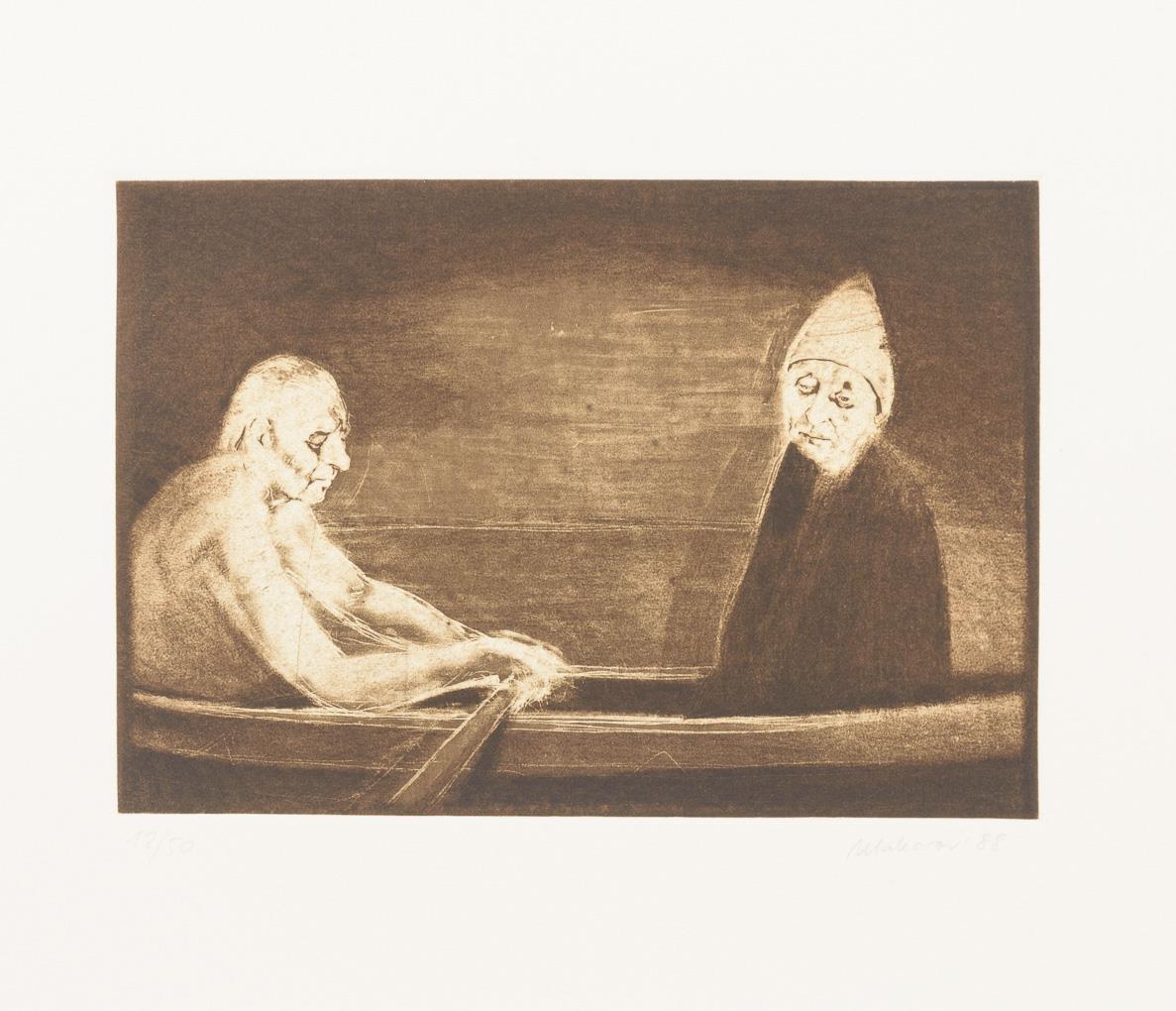 Complete, original cassette-folder with 10 etchings and 1 title-page to a cycle of paintings by Nikolai Makarov - "Painted in muted colours or in the grisaille technique, the paintings of the cycle "The Late Freedom", created between 1984 and 1987, show elderly people depicted [sic!] by Nikolai Makarov alone or in groups. Their resigned posture and facial expressions convey a sense of hopelessness and humbly endured hardship. Crouching in front of a diffuse monochrome background, portrayed frontally or in profile without any accessories, or symbolically united with each other in a boat, the aged individuals of "Late Freedom" convey a metaphorical view of the personal crises of a generation cheated of its life, which will no longer be able to savour its freedom, questions itself and states that it has a score to settle with life." (quote seen at http://www.nikolai-makarov.de/gallery/spaete-freiheit.html).