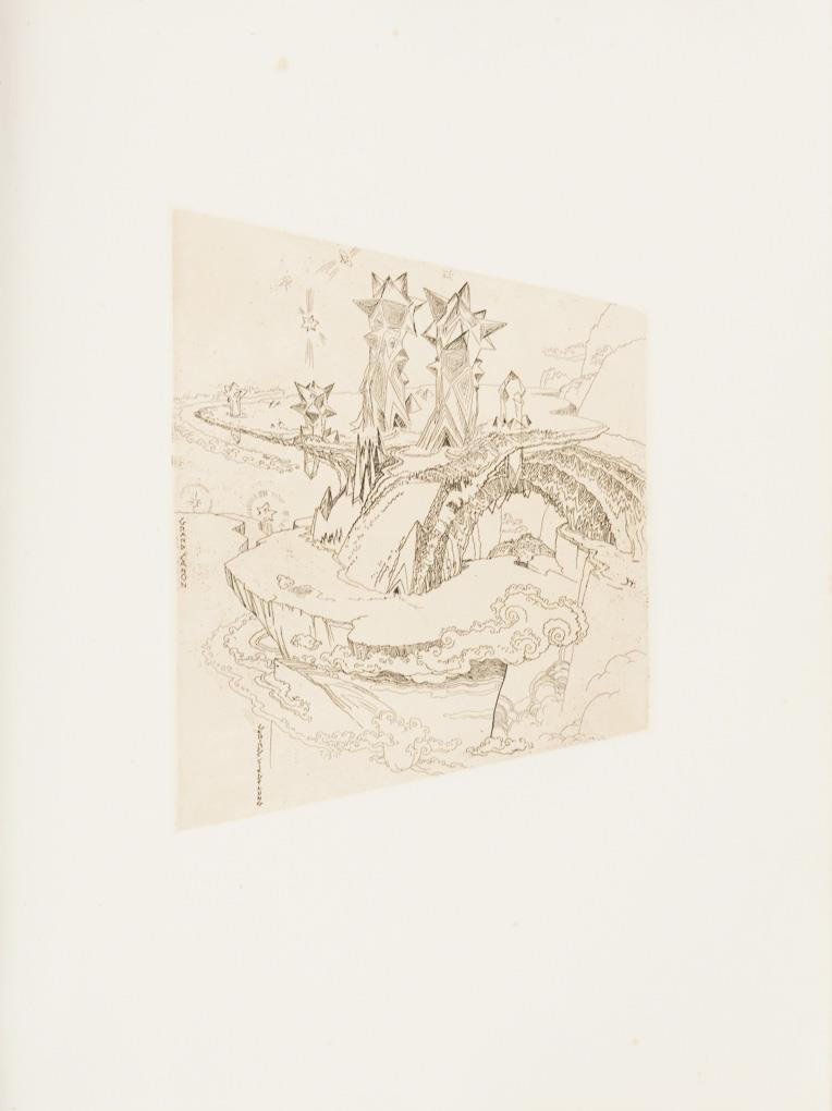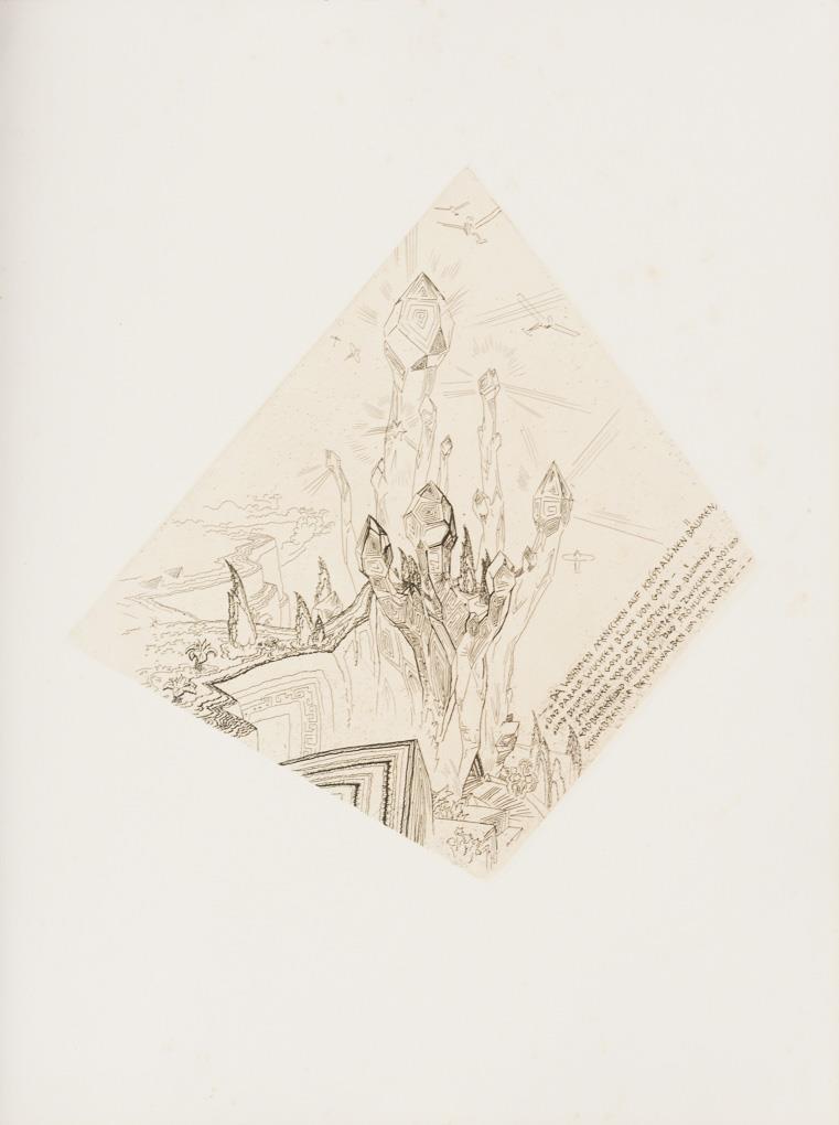 "There people live on crystall'nen trees"|"Grand Canon - Mountain Settlement". Each foxed.