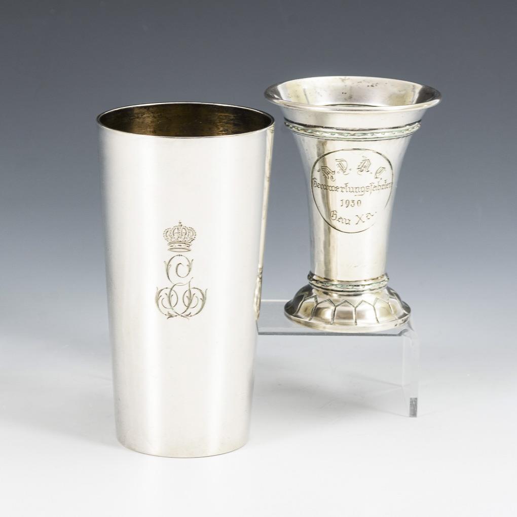 1x small ADAC cup "Gauwertungsfahrten 1930. Gau 10a". / 1x tall conical militaria cup of the 6th Thuringian Infantry Regiment with dedication "Oberzahlmeister Binn, 40 Dienstjahre 1. 4. 03, Offiziere III/95.", on verso crowned monogram engraving Georg II. Internally gilt. Minimally dented.