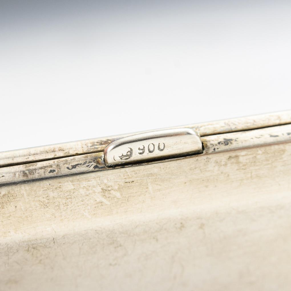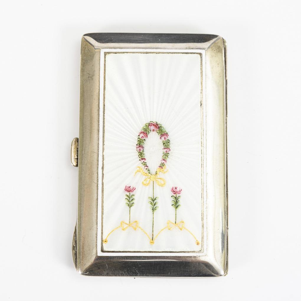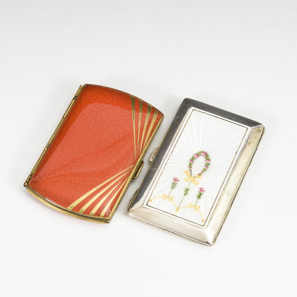 Coral red enamelled Art Deco brass box and silver case with rose garland decoration. Signs of age and wear.