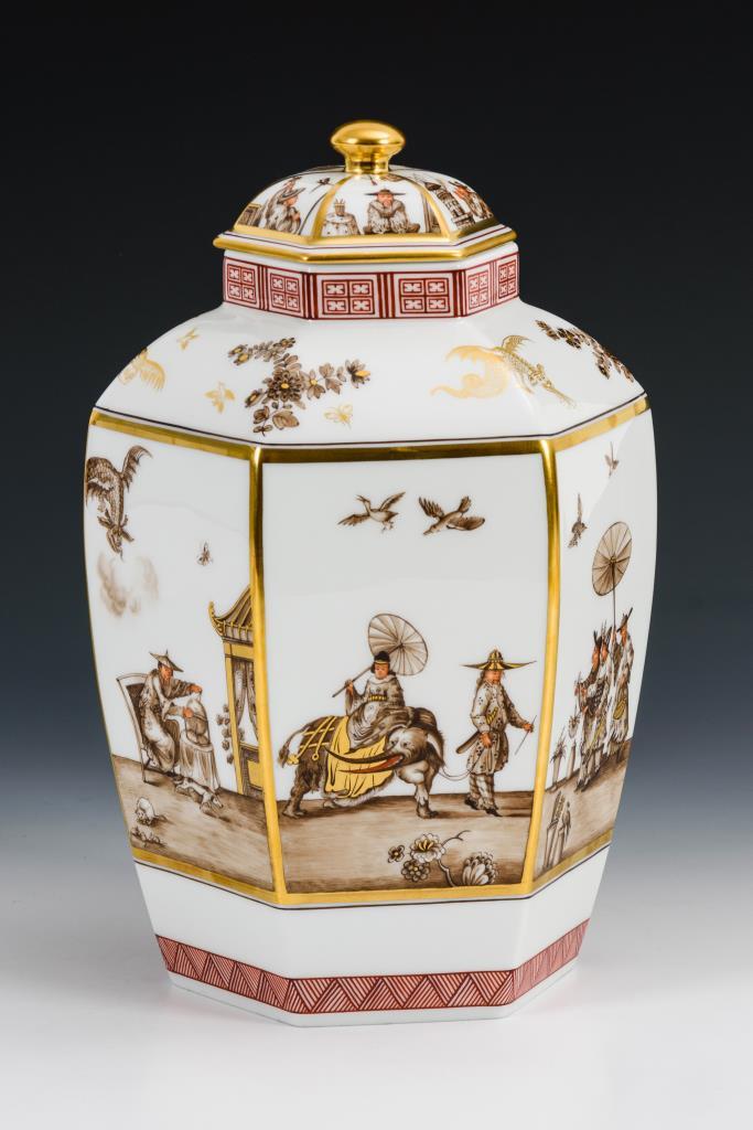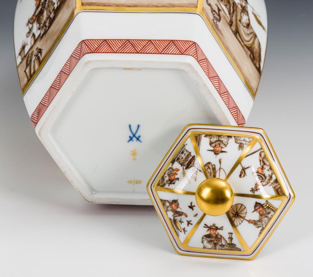 Sechseckige Vase mit Knaufdeckel. Allseitig überwiegend in Sepia gemalte Chinesenszenen.