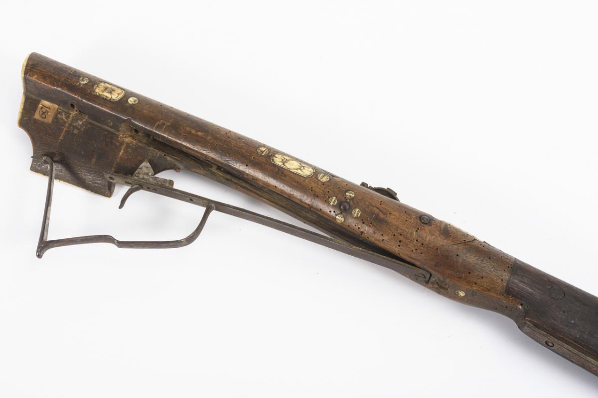 Lightweight stock in the form of a rifle butt, partly with carved decoration and pictorial representations on larger leg inlays. Numerous small leg discs with patterning. Sighting device, tendon clamp, trigger and trigger guard present. Smaller leg plates missing, traces of old anobia infestation.