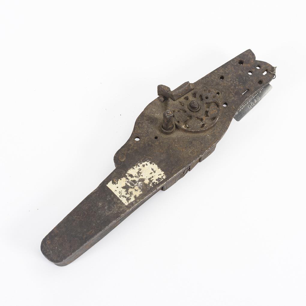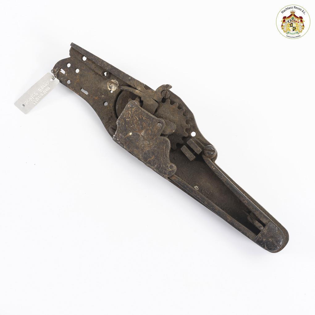 Next to the actual ignition wheel, the wheel cover of which is worked openwork, is a drive wheel. Therefore, the winding axle is somewhat to the side. Engraving difficult to discern, partly under remainder of adhesive label. Without cock and pan slider as well as brake. piece corroded.