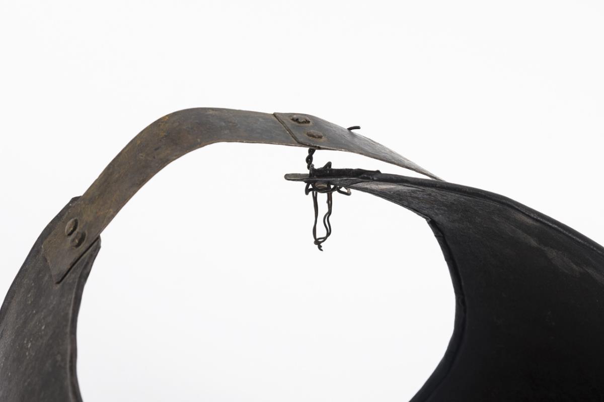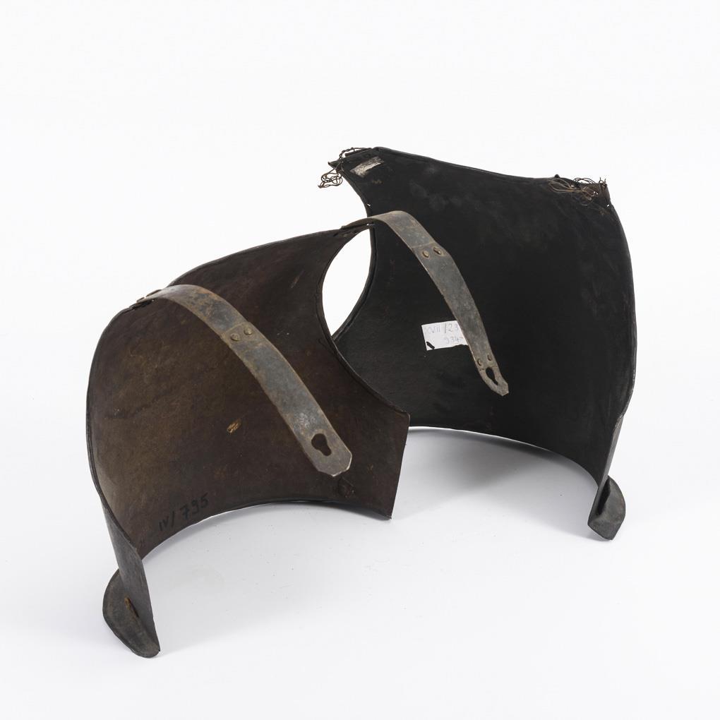 Front and back with flared lower rim. Black paint finish. Remnants of leather straps, possibly not matching. Stronger signs of age and use.