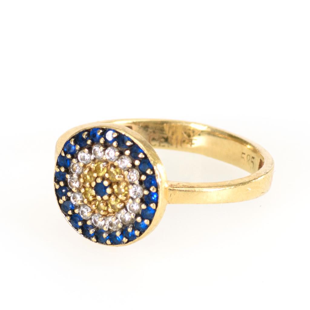 Scheibenringkopf mit kleinen Saphiren, farblosen und gelben eingelassenen Steinen?. Schmale Schiene.
