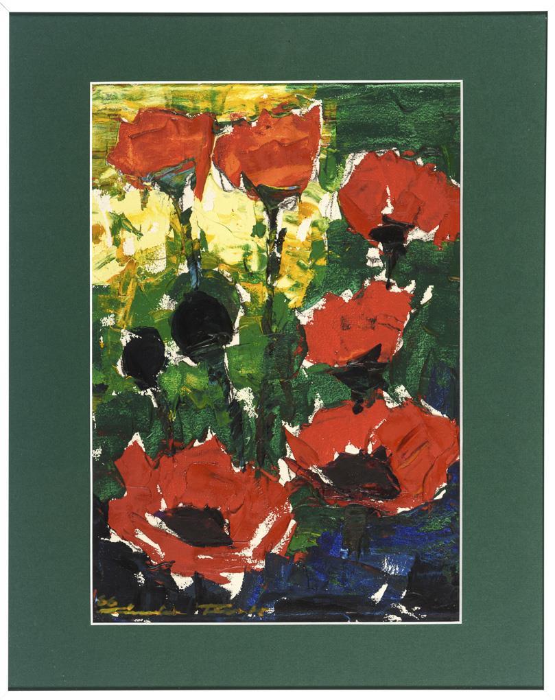 Pastos and roughly spatulated poppy blossoms, before green background.