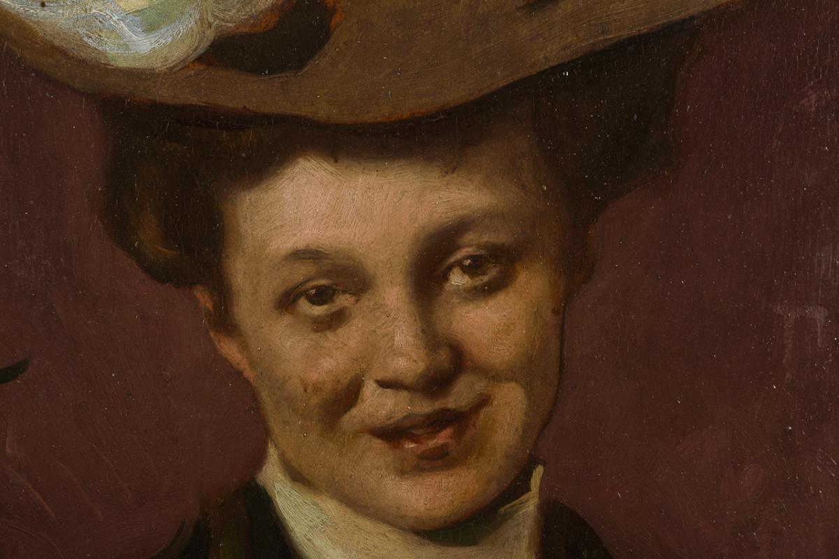 Art Nouveau portrait of a young woman with fur coat and striking hat. Was pictured in the magazine "Die Jugend". Signs of age.